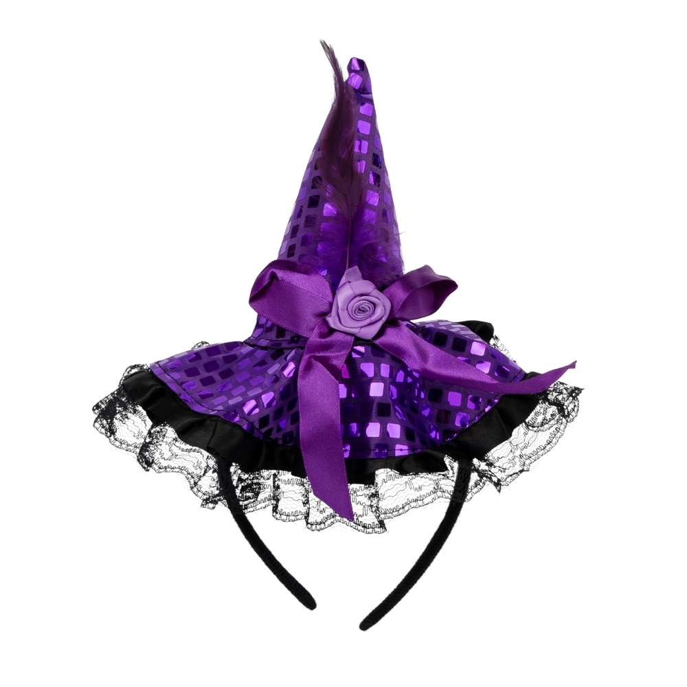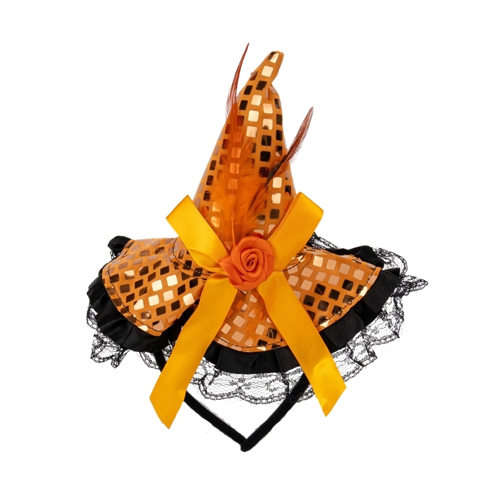 Висота (разом з ободком) - 26 см, діаметр - 10 см. Ободок на Хелловін – це класичний атрибут святкового костюма, який додає образу чарівності та містичності. Він виготовлений з щільної тканини та декорований пір'ям та тематичними візерунками, бантами, що додають ободку особливого шарму та загадковості. Цей аксесуар є незамінною деталлю для створення ефектного і завершеного образу відьми на будь-якій вечірці.