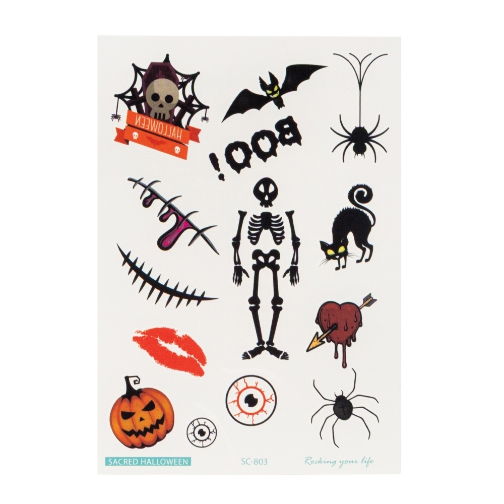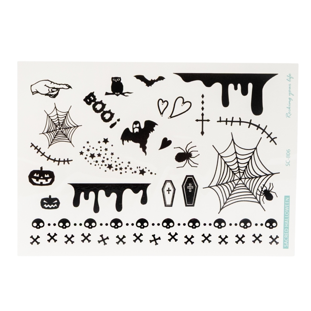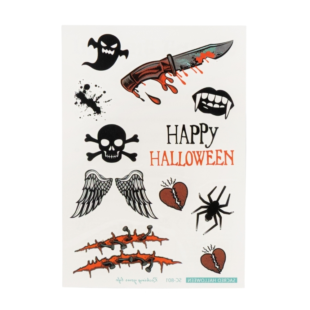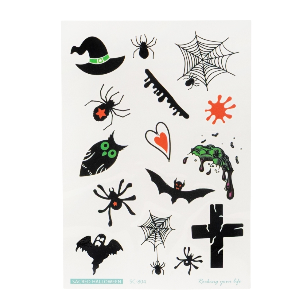 Тату розміром від 1 до 8 см. Універсальний набір моторошних елементів: павуки, летючі миші, павутина, хрести, написи «Boo» та інші деталі для створення атмосферного образу. Легко наносяться, підходять для обличчя і тіла, не розмазуються та чудово доповнюють карнавальний костюм. Як застосовувати? Виріжте обраний малюнок і зніміть захисну плівку. Прикладіть тату до шкіри липкою стороною вниз. Змочіть папір водою, поки він добре не просочиться. Легко притисніть тату до шкіри на 10 секунд. Обережно зніміть папір — готово!