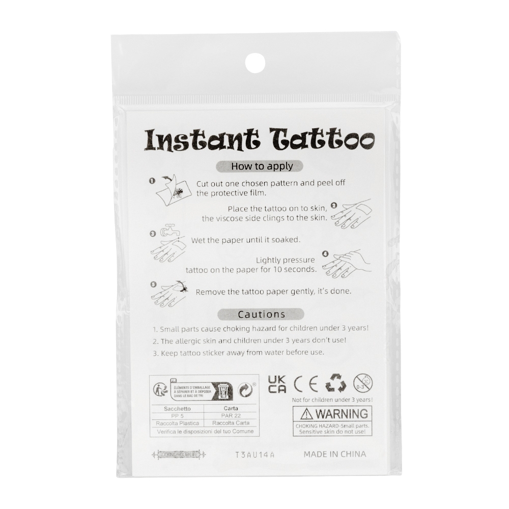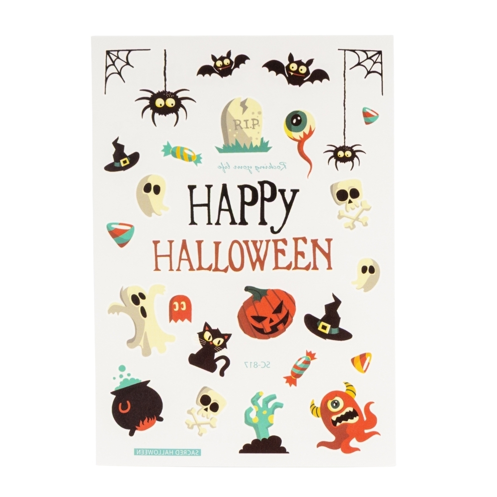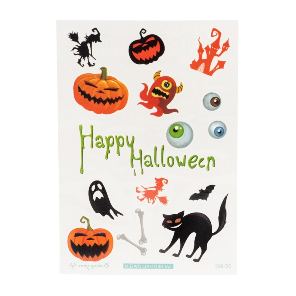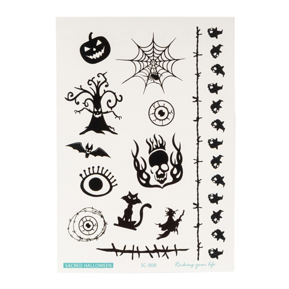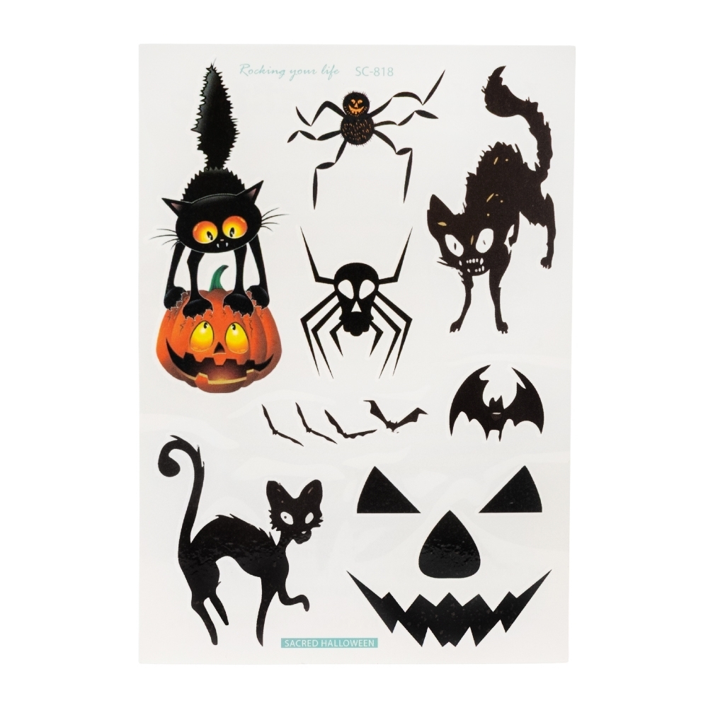 Тату розміром від 1 до 8 см. Універсальний набір моторошних елементів: павуки, летючі миші, павутина, хрести, написи «Boo» та інші деталі для створення атмосферного образу. Легко наносяться, підходять для обличчя і тіла, не розмазуються та чудово доповнюють карнавальний костюм. Як застосовувати? Виріжте обраний малюнок і зніміть захисну плівку. Прикладіть тату до шкіри липкою стороною вниз. Змочіть папір водою, поки він добре не просочиться. Легко притисніть тату до шкіри на 10 секунд. Обережно зніміть папір — готово!
