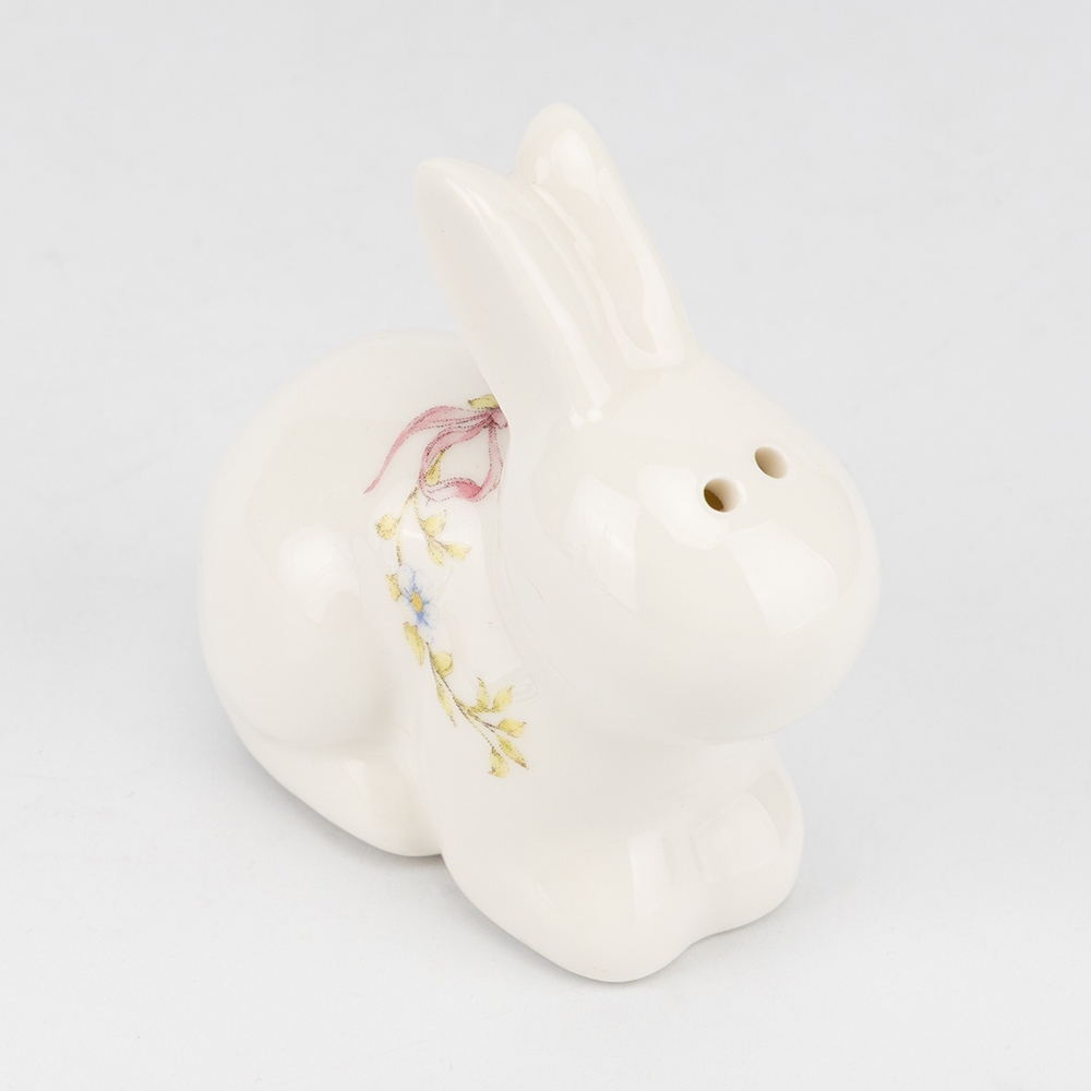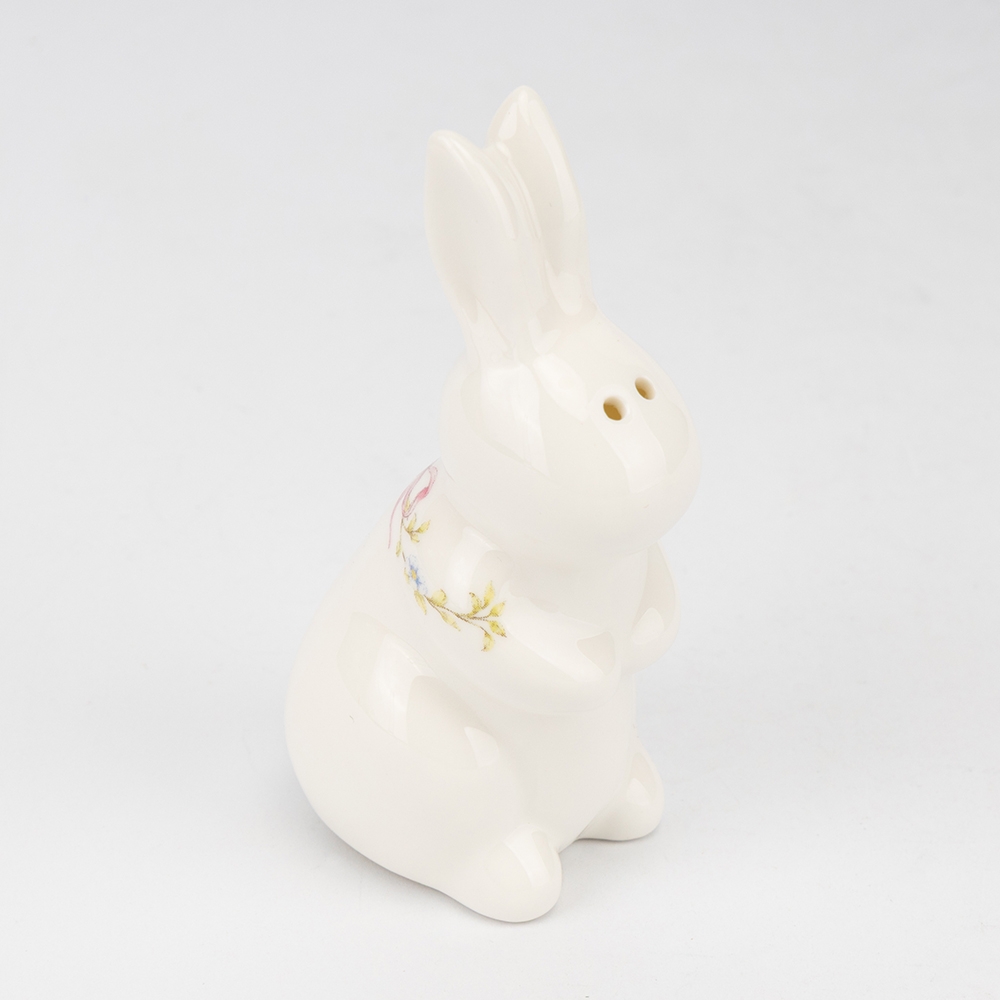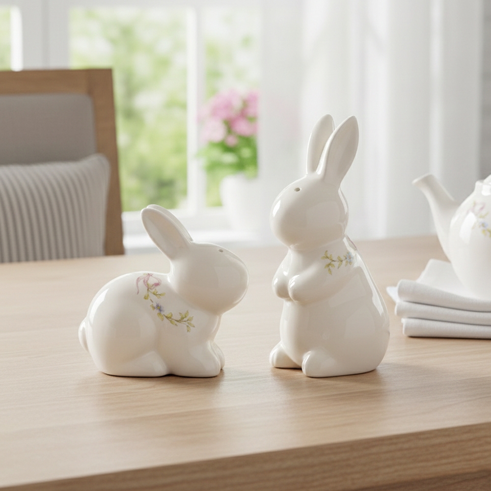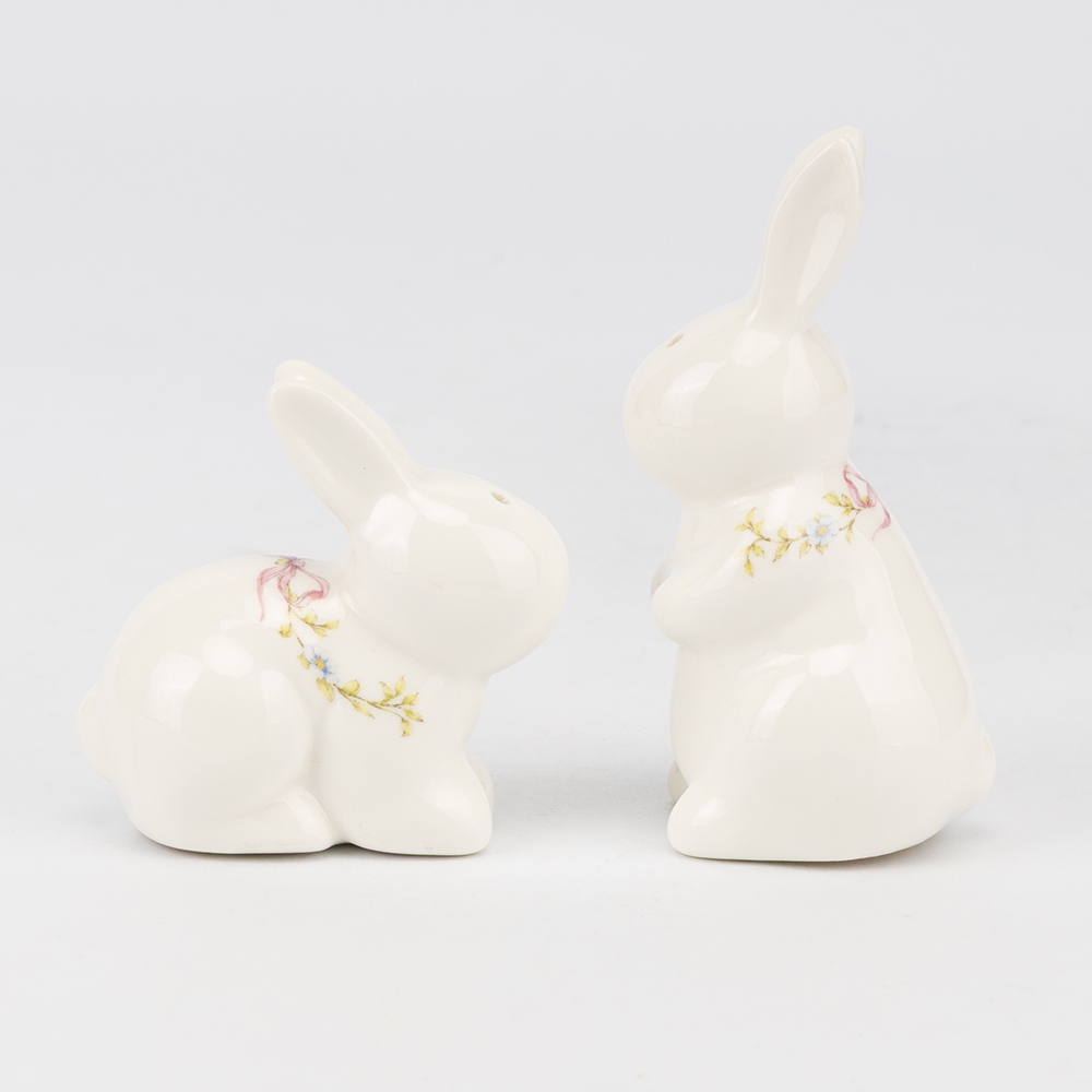 Висота — 10 см, ширина — 4 см. Набір для спецій — мила і функціональна деталь кухонного декору. Дві керамічні фігурки кроликів зі стильним ніжним орнаментом стануть прикрасою будь-якого столу. Компактний розмір, акуратні отвори та якісна глазур роблять набір зручним і практичним у використанні. Такий комплект не лише додає затишку, але й підкреслює особливість весняного або святкового сервірування. Чудовий подарунок для поціновувачів красивого посуду та тематичного декору.