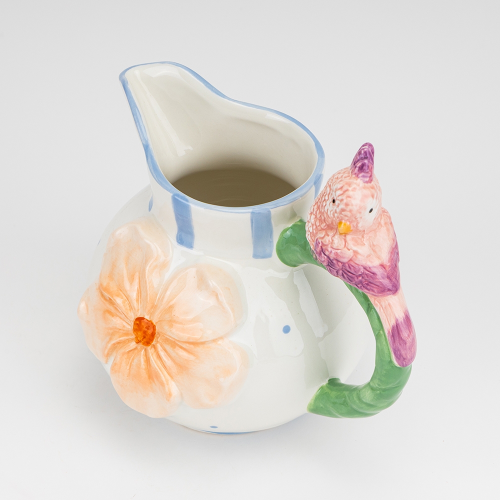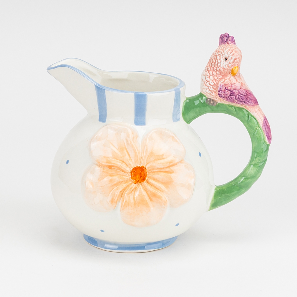 Висота — 19 см, Діаметр — 16 см. Довжина — 20 см. Керамічна ваза з декоративним папугою поєднує в собі витончену форму та художній настрій весни. Об’ємний квітковий рельєф і м’які лінії створюють відчуття легкості та живої природи, а образ птаха додає композиції тепла й затишку. Така ваза стане яскравим акцентом у інтер’єрі, чудово підійде для невеликих букетів, сухоцвітів або як самостійний елемент декору, наповнюючи простір світлом і позитивною атмосферою.