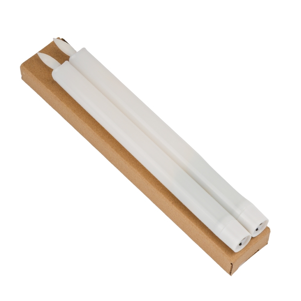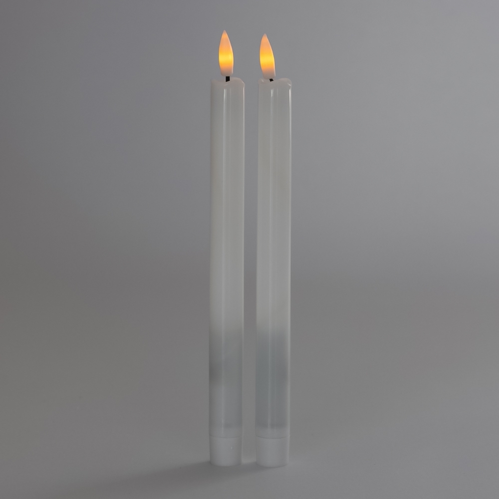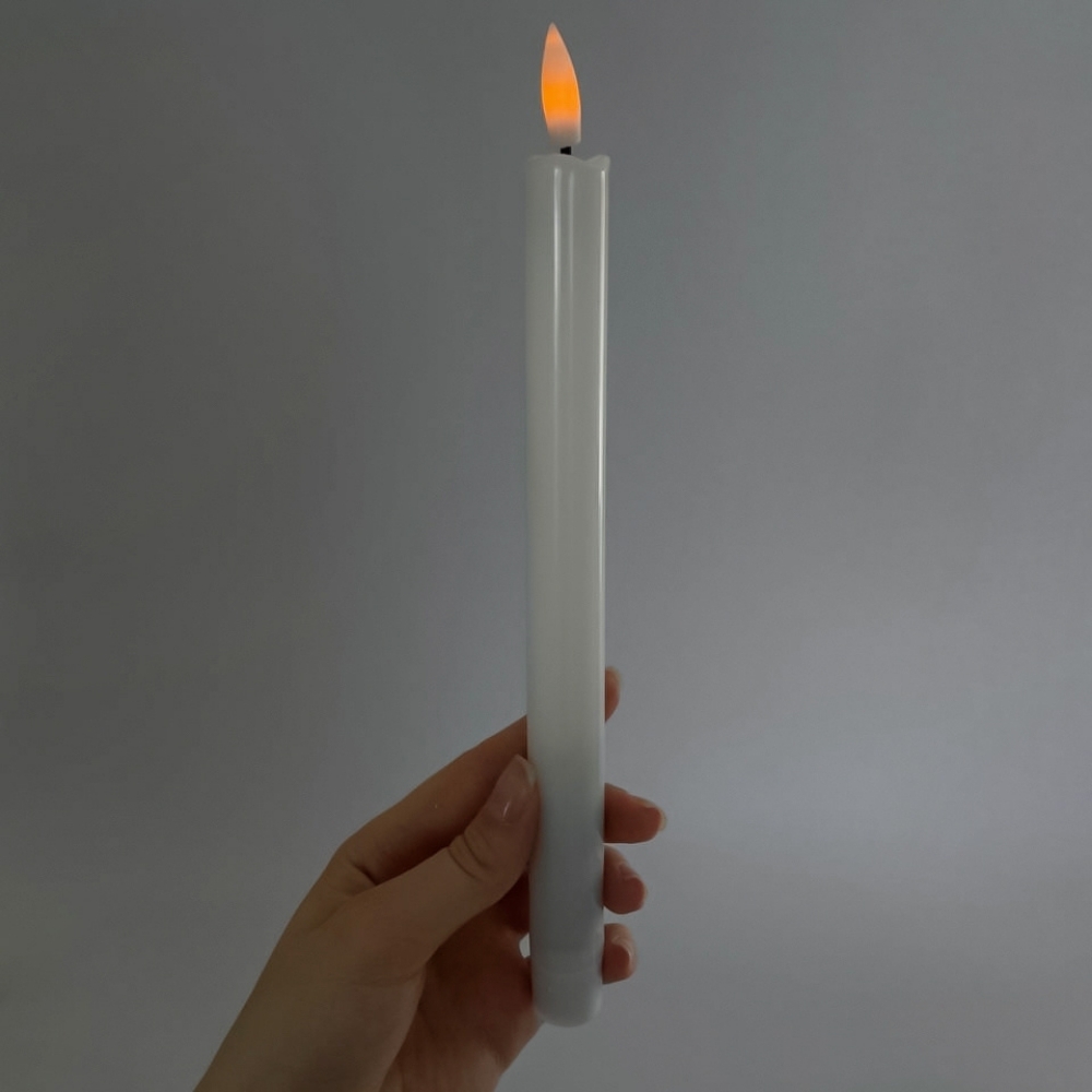 Електричні свічки працюють від вбудованого акумулятора, який заряджається через USB. Свічки виготовлені з легкого пластику й оснащені LED-лампочкою, що імітує полум’я. Висота - 26 см, діаметр - 2,2 см. Їх витягнута форма класичної воскової свічки ідеально підходить для декорування святкових столів, інтер’єрів у стилі HoReCa або фотозон. Завдяки безпечному дизайну їх можна використовувати в місцях з дітьми або вітринних експозиціях. Свічки створюють затишну атмосферу без відкритого вогню та диму.