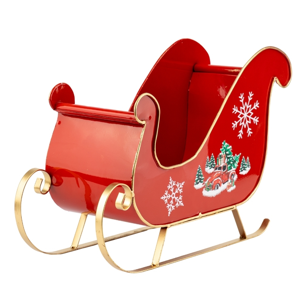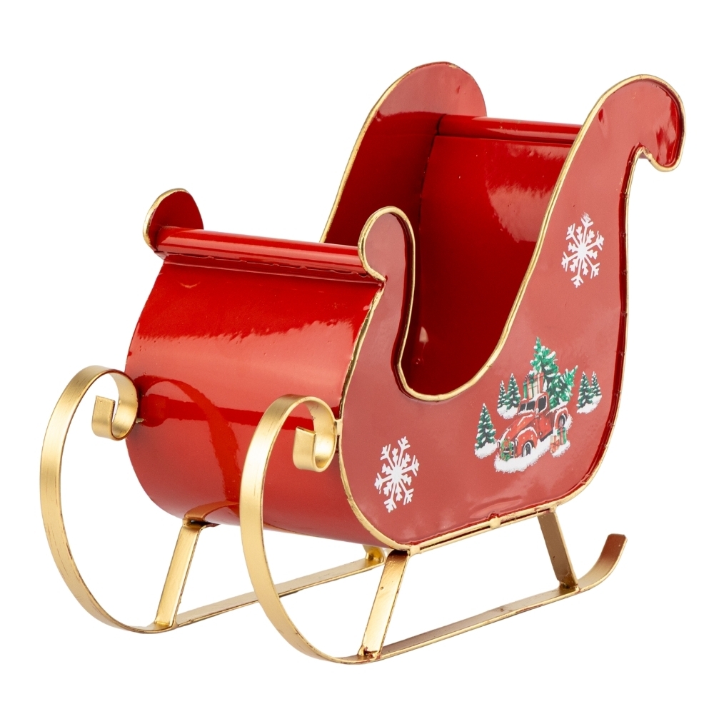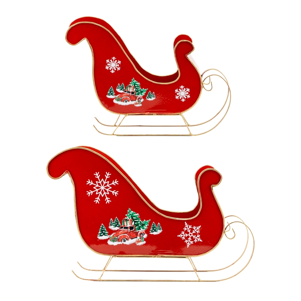 Набір з 2 металевих саней, великі мають розміри: довжина — 42 см, висота — 27 см, ширина — 15,5 см. Менші — довжина 32,5 см, висота 24 см, ширина — 12 см. Обидві моделі оформлені яскраво-червоним кольором із святковими малюнками та золотими полозками. Чудово підходять для тематичних композицій, вітрин, або як оригінальна підставка для подарунків. Ідеально доповнять новорічний декор.