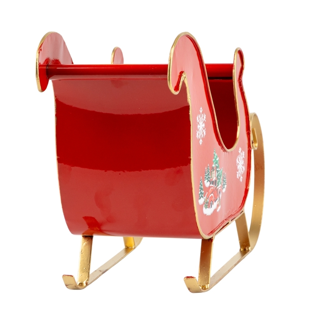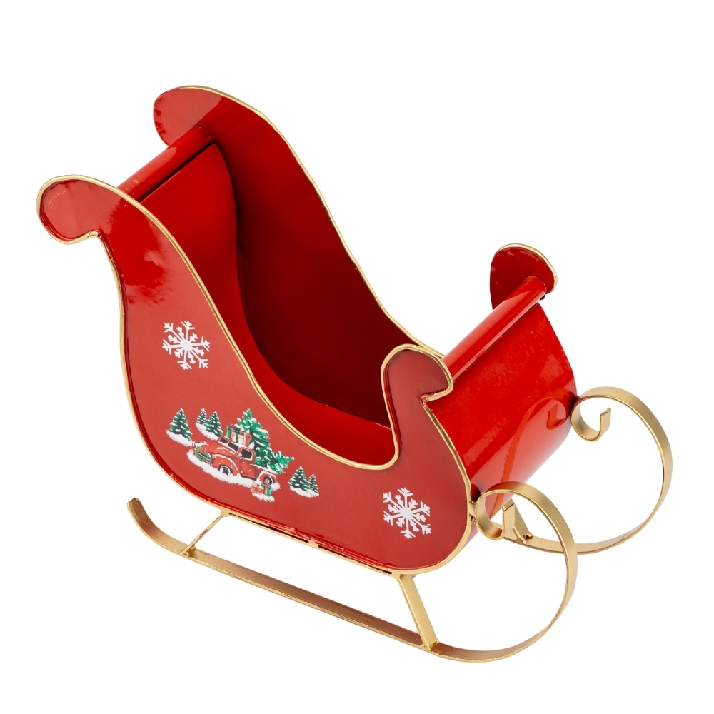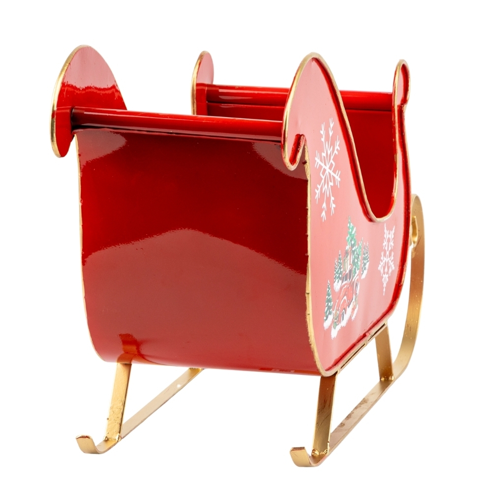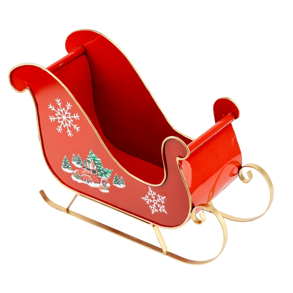Набір з 2 металевих саней, великі мають розміри: довжина — 42 см, висота — 27 см, ширина — 15,5 см. Менші — довжина 32,5 см, висота 24 см, ширина — 12 см. Обидві моделі оформлені яскраво-червоним кольором із святковими малюнками та золотими полозками. Чудово підходять для тематичних композицій, вітрин, або як оригінальна підставка для подарунків. Ідеально доповнять новорічний декор.