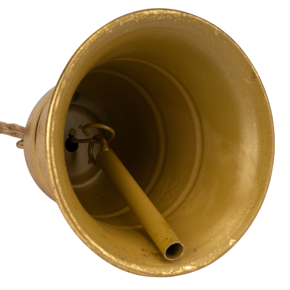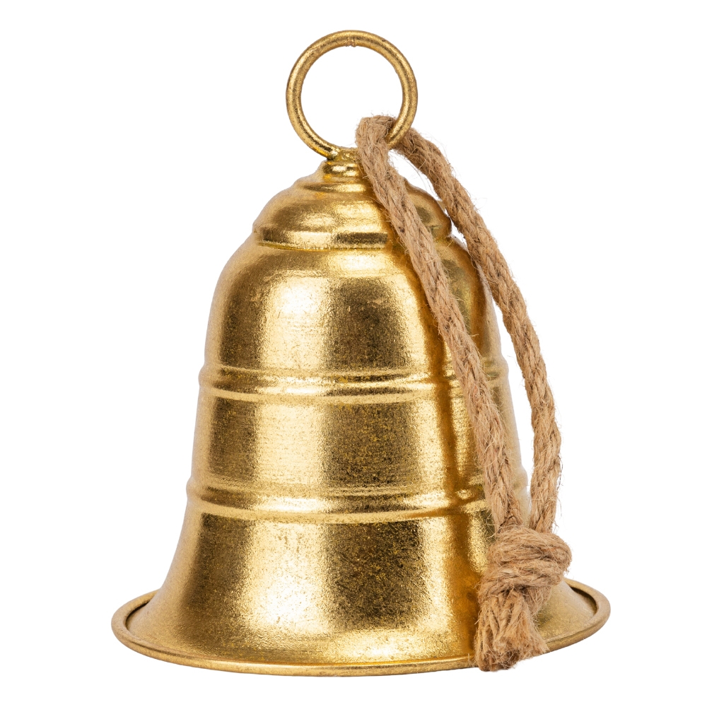 Металевий дзвіночок, висота без мотузки - 21 см. Діаметр дзвіночка - 15,5 см. Завдяки компактним розмірам і дзвінкому звучанню він чудово підходить для оформлення різдвяних або весільних локацій, фотозон чи святкових заходів. Дзвіночок виготовлений із фактурного металу з теплим золотим покриттям. Оснащений джутовим шнуром і металевим кільцем для легкого й надійного кріплення до гірлянд, арок або підвісних конструкцій.