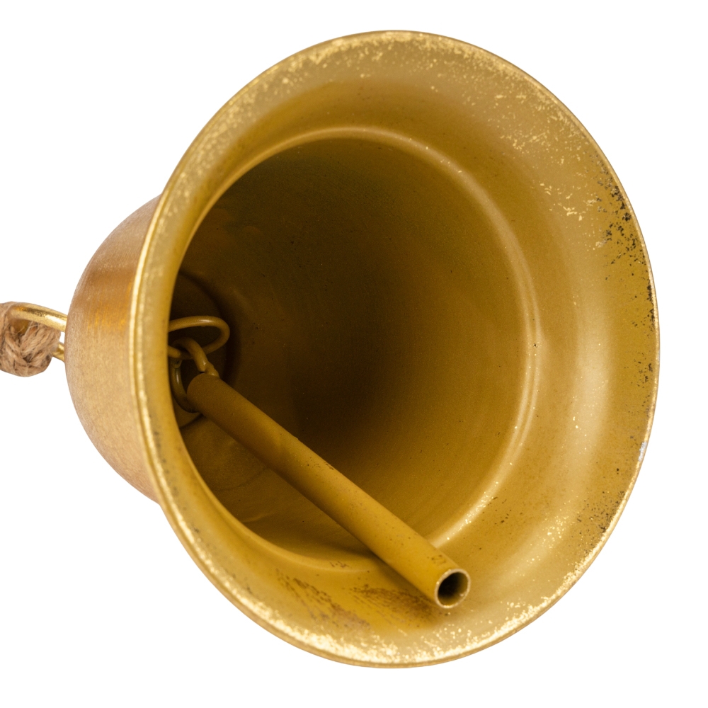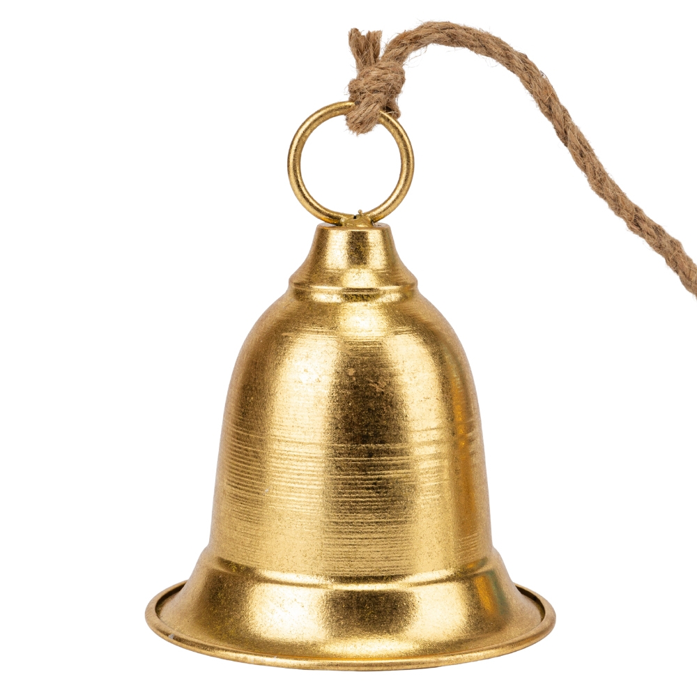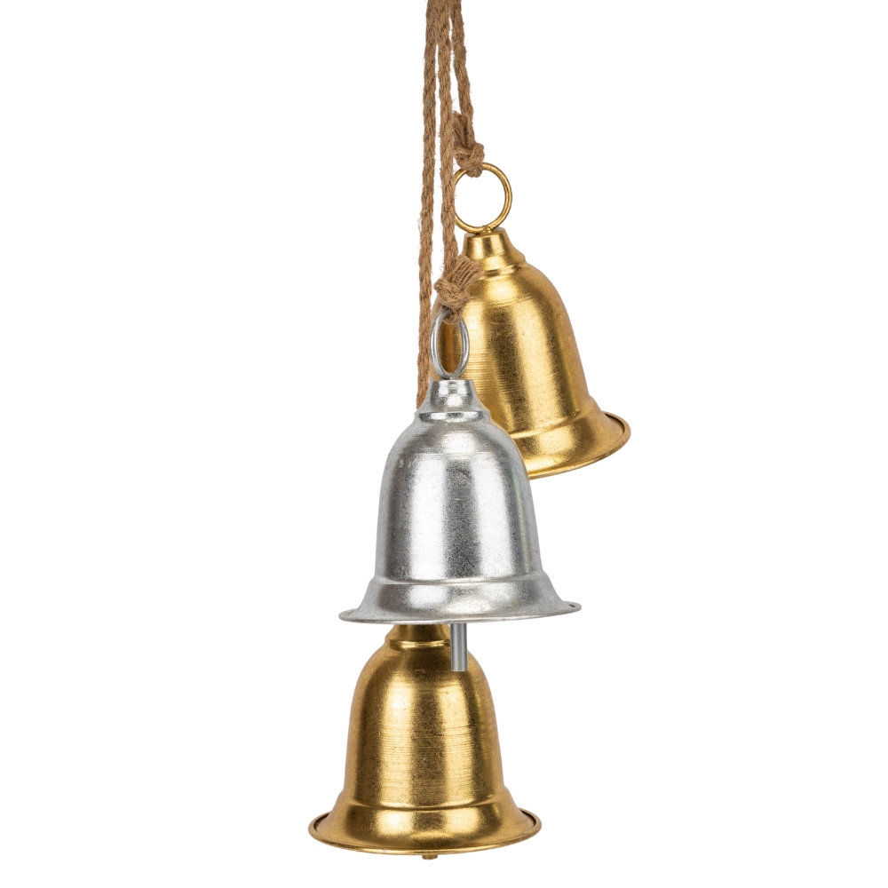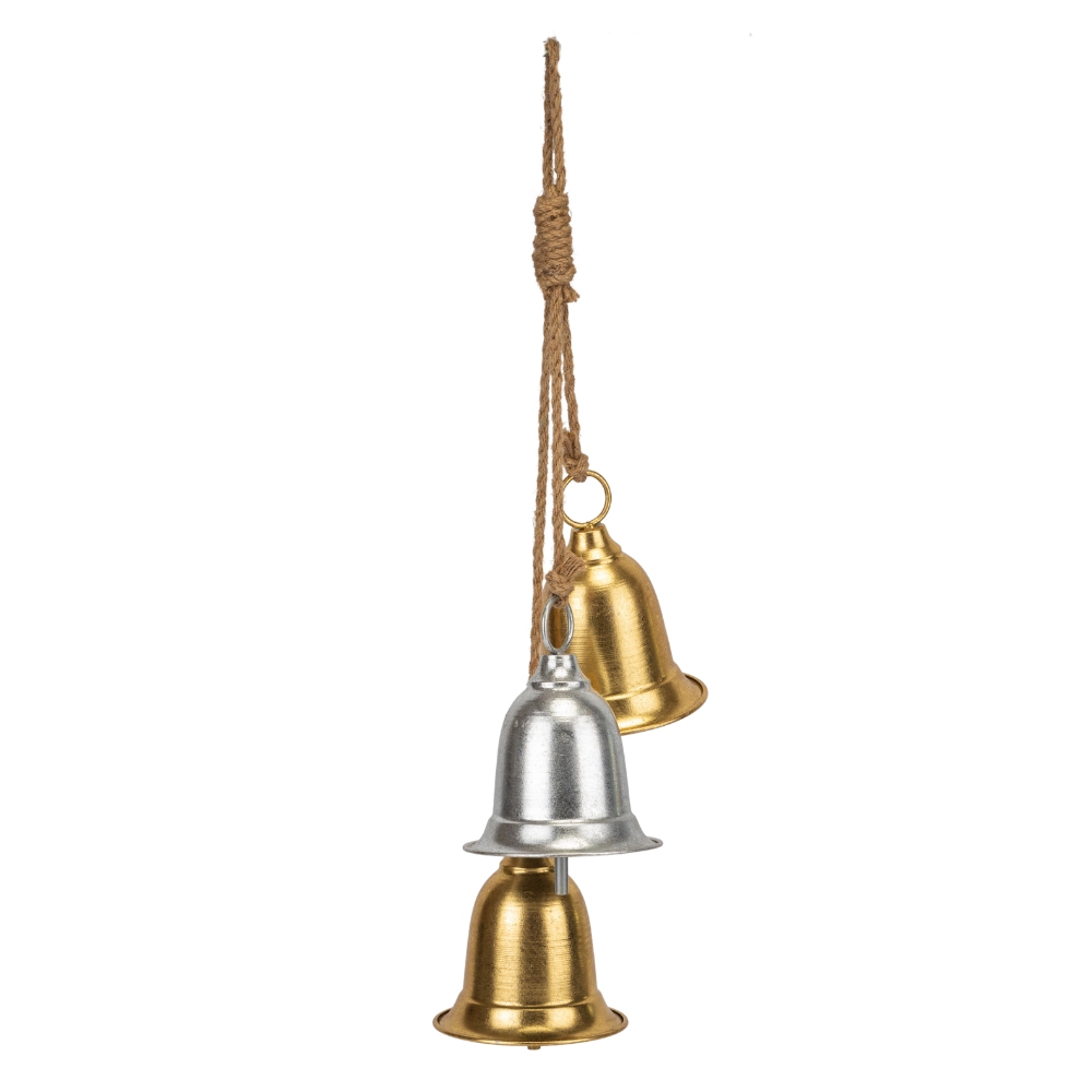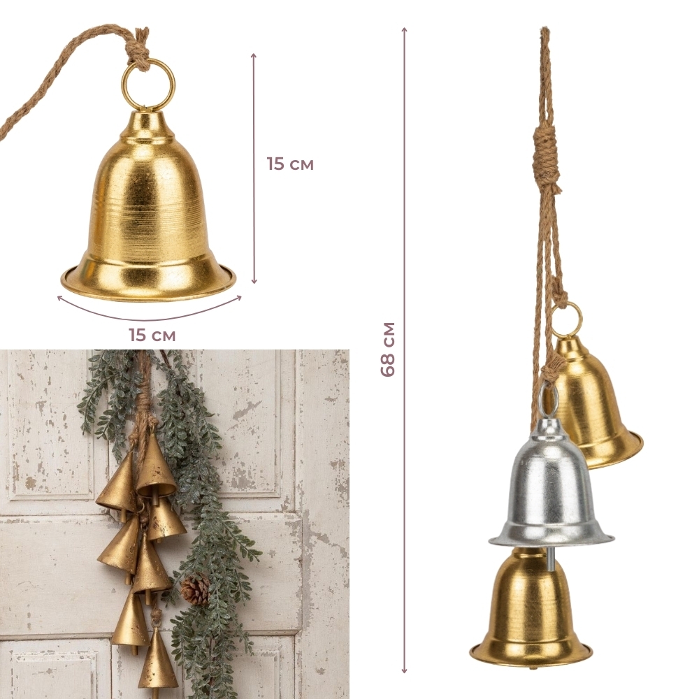 Підвіска з трьох металевих дзвіночків має висоту 68 см. Діаметр кожного дзвіночка - 15 см. Підвіска стане яскравим елементом святкового оформлення. Три дзвіночки кріпляться на міцному джутовому шнурі, який дозволяє легко підвісити декор на двері, стіну чи ялинку. Кожен дзвінкий елемент створює виразний, гучний звук, додаючи живого настрою до новорічних чи різдвяних подій. Блиск і класична форма дзвіночків роблять цю підвіску ідеальною для традиційного святкового декору.