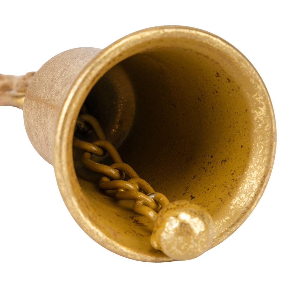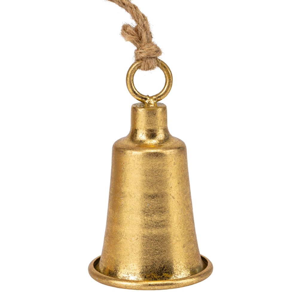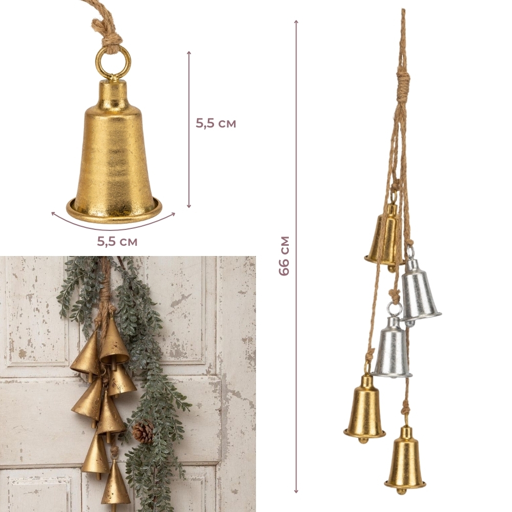Підвіска з п'яти металевих дзвіночків має висоту 66 см. Діаметр кожного дзвіночка - 5,5 см. Підвіска стане яскравим елементом святкового оформлення. П'ять дзвіночків кріпляться на міцному джутовому шнурі, який дозволяє легко підвісити декор на двері, стіну чи ялинку. Кожен дзвінкий елемент створює виразний, гучний звук, додаючи живого настрою до новорічних чи різдвяних подій. Блиск і класична форма дзвіночків роблять цю гірлянду ідеальною для традиційного святкового декору.