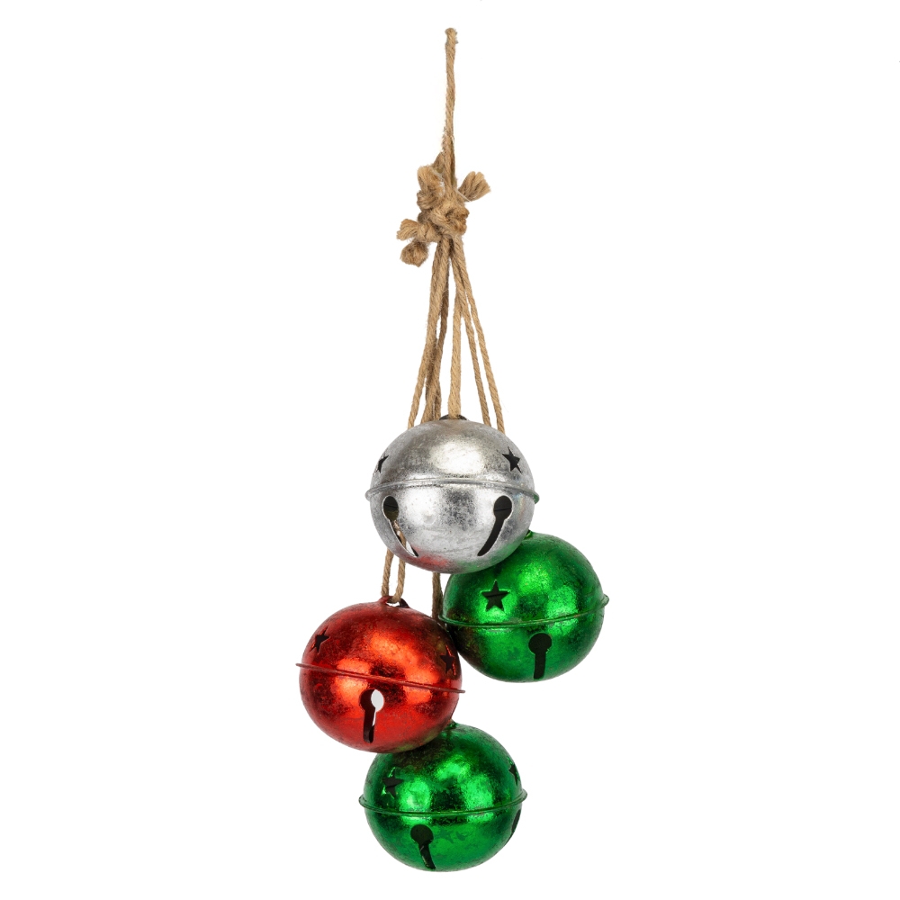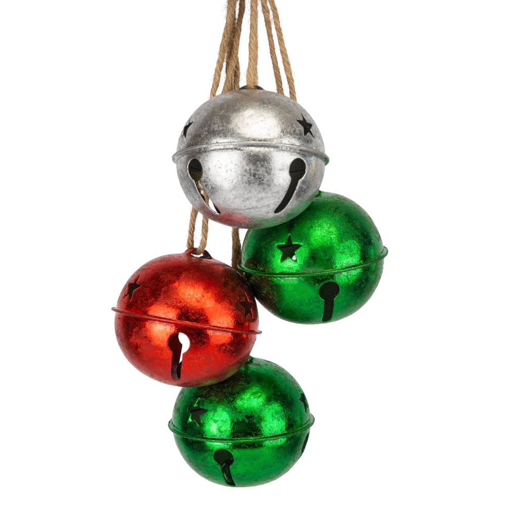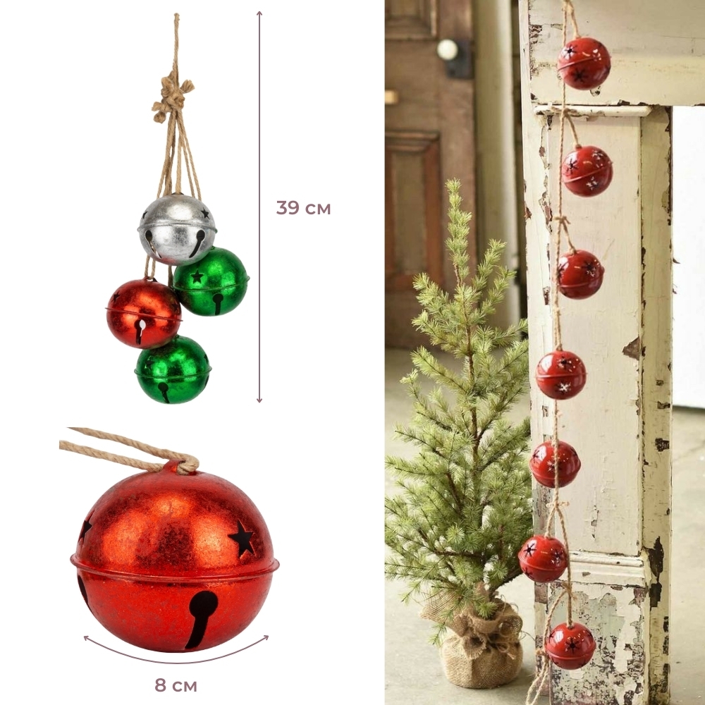Підвіска з чотирьох металевих дзвіночків має висоту 39 см. Діаметр кожного дзвіночка - 8 см. Підвіска стане яскравим акцентом для новорічного або тематичного декору. Дзвіночки оздоблені фігурними вирізами у формі зірок і мають гучне, дзвінке звучання. Конструкція підвішена на міцному джутовому шнурі, що забезпечує зручне й надійне кріплення до гачків, гілок чи арок. Ідеально підходить для оздоблення інтер’єру, вітрин, входу або святкових інсталяцій.