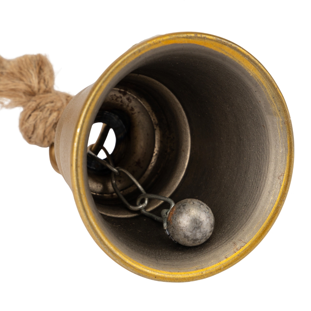 Металевий дзвіночок, висота без мотузки - 8 см, з мотузкою - 20,5 см. Діаметр дзвіночка - 6,5 см. Завдяки міцній конструкції та внутрішньому язичку він видає гучний, чистий звук, ідеально підходячи для тематичних подій, фотозон або святкового оздоблення. Оснащений металевим кільцем і джутовим шнуром для зручного кріплення на арках, конструкціях чи декоративних інсталяціях.