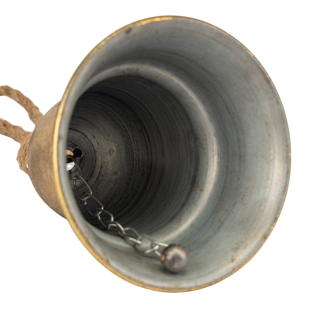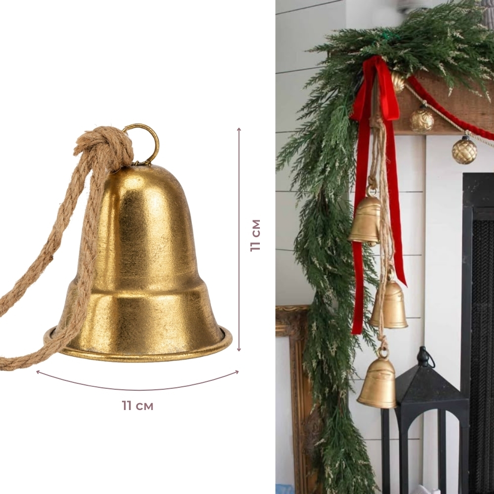 Металевий дзвіночок, висота без мотузки - 11 см. Діаметр дзвіночка - 11 см. Він стане виразним акцентом у святковому чи тематичному оформленні. Завдяки міцному язичку всередині він створює гучний і чистий звук. Дзвіночок підвішується за допомогою джутового шнура, зафіксованого на металевому кільці — це дозволяє легко монтувати його до гілок, дверей або декоративних елементів. Ідеально підходить для декору інтер’єру, фасаду, вітрин або фотозон.