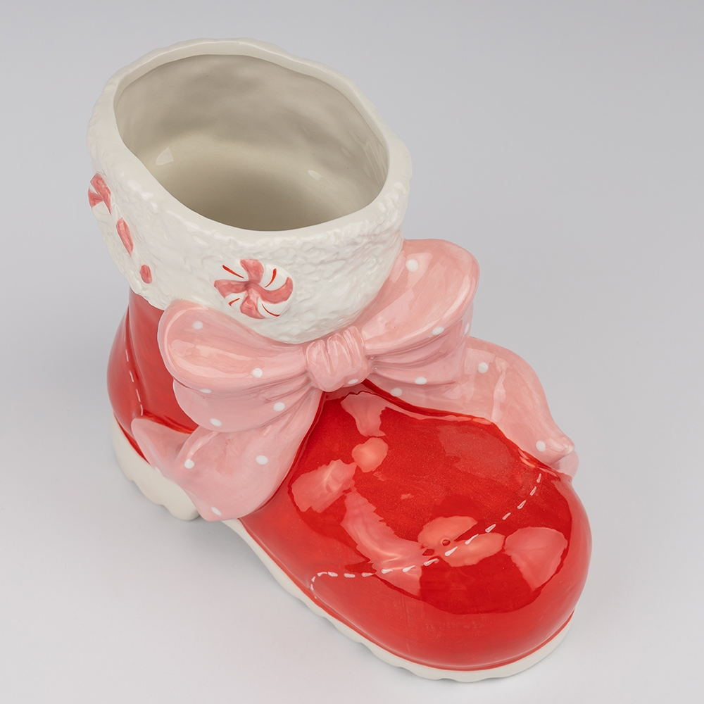 Висота - 18 см, довжина - 20 см, ширина - 10 см. Цей яскравий керамічний горщик у формі новорічного чобітка стане чудовим акцентом у зимовому декорі дому чи вітрини. Він зручно використовується для квітів, декоративних гілочок чи композицій і виготовлений з якісної кераміки, що забезпечує довговічність і святковий вигляд на багато сезонів. Такий горщик легко поєднується з будь-яким новорічним стилем і додає затишку у святкові дні.