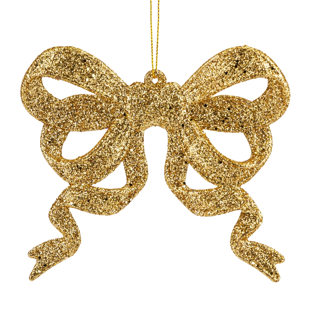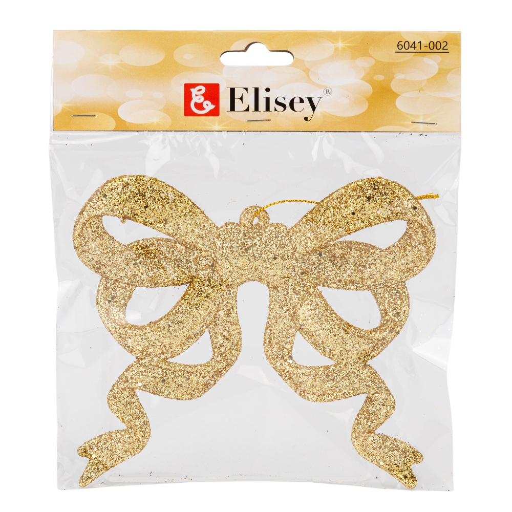 Золота блискуча ялинкова іграшка з пластику у вигляді бантику стане яскравим акцентом у вашому святковому декорі. Її поверхня вкрита дрібними блискітками, які красиво переливаються під світлом гірлянд, створюючи ефект розсіяного сяйва. Легка та міцна, вона ідеально підходить для прикрашання ялинки, надаючи їй ніжності та святкового шарму.