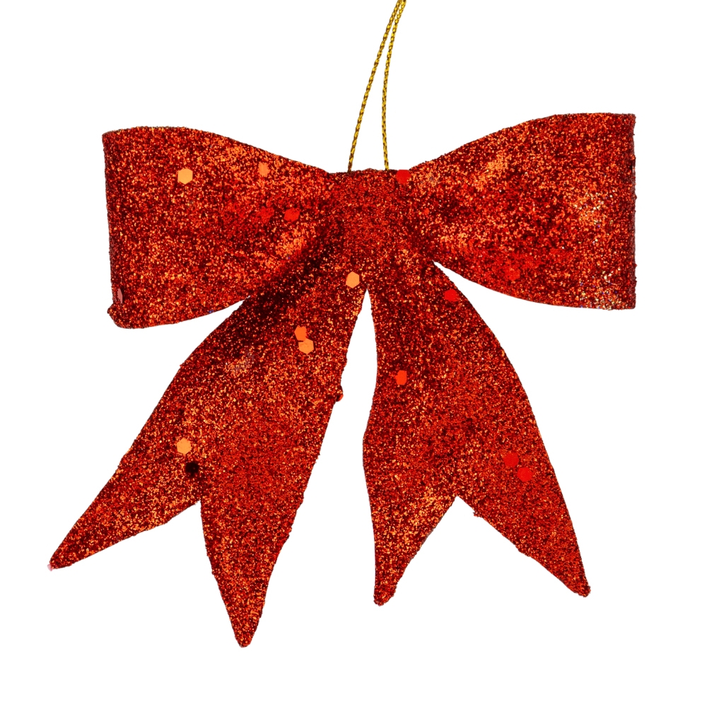 Червона блискуча ялинкова іграшка з пластику у вигляді бантику стане яскравим акцентом у вашому святковому декорі. Її поверхня вкрита дрібними блискітками, які красиво переливаються під світлом гірлянд, створюючи ефект розсіяного сяйва. Легка та міцна, вона ідеально підходить для прикрашання ялинки, надаючи їй ніжності та святкового шарму.