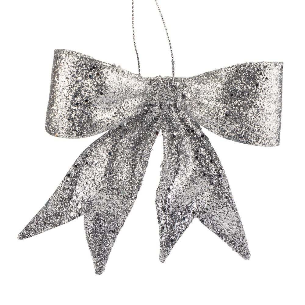 Срібна блискуча ялинкова іграшка з пластику у вигляді бантику стане яскравим акцентом у вашому святковому декорі. Її поверхня вкрита дрібними блискітками, які красиво переливаються під світлом гірлянд, створюючи ефект розсіяного сяйва. Легка та міцна, вона ідеально підходить для прикрашання ялинки, надаючи їй ніжності та святкового шарму.