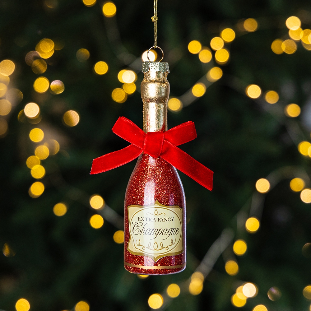 Зверніть увагу, що внаслідок недавньої атаки дронів частина партії цього товару має пошкоджене оригінальне пакування. Також присутній аромат гарі, який повністю вивітрюється протягом деякого часу. Висота іграшки — 12,5 см, ширина — 3,7 см. Ця гламурна скляна ялинкова іграшка має форму пляшки шампанського, прикрашена витонченою етикеткою "Extra Fancy Champagne" та елегантним червоним оксамитовим бантом. Вона стане сміливим, яскравим та урочистим акцентом у вашому новорічному декорі. Цей декор ідеально підійде для створення святкової атмосфери та додасть нотку розкоші вашій ялинці.