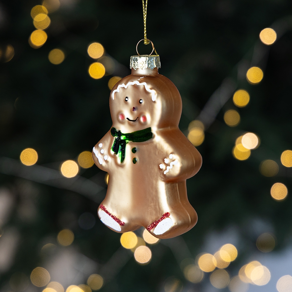 Зверніть увагу, що внаслідок недавньої атаки дронів частина партії цього товару має пошкоджене оригінальне пакування. Також присутній аромат гарі, який повністю вивітрюється протягом деякого часу. Висота іграшки — 10 см, довжина — 6,5 см, ширина — 2,3 см. Ця мила скляна ялинкова іграшка виконана у формі різдвяного імбирного чоловічка, що символізує затишок, домашнє тепло та святкові традиції. Іграшка має теплий золотисто-коричневий колір та прикрашена яскраво-зеленим шарфом і деталями, що імітують білу глазур. Вона додасть вашій ялинці грайливий, традиційний та надзвичайно чарівний акцент.