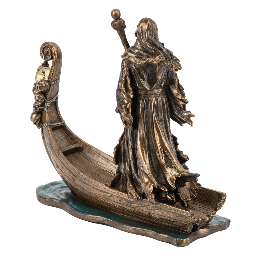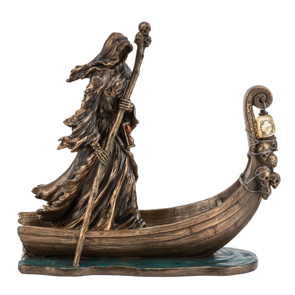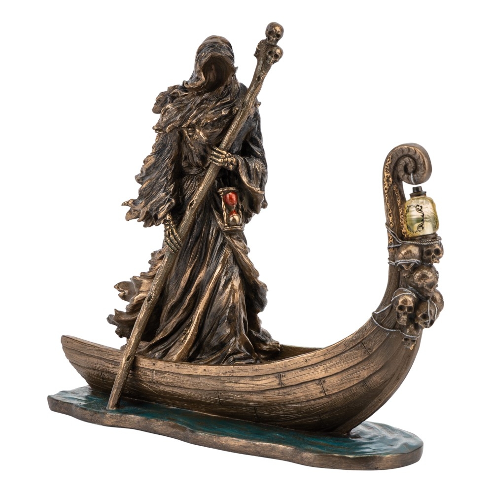 Висота статуетки — 25 см, довжина — 26, ширина — 10 см. Статуетка Veronese виготовлена з полістоуну — штучного каменю. Запакована в подарункову коробку. Упаковка з пінопласту з індивідуальними поглибленнями для кожного елемента забезпечує максимальний захист товару під час транспортування. Ця фігура уособлює таємницю переходу між світами — легендарний Харон, перевізник душ через річку Стикс. Деталізація бронзового покриття передає кожну складку плаща, старовинний човен і моторошні символи смерті. Пісочний годинник у його руці нагадує про швидкоплинність часу, а темна вода під човном — про вічну подорож у невідомість. Статуетка стане символом філософського осмислення життя, сили долі та неминучості часу.