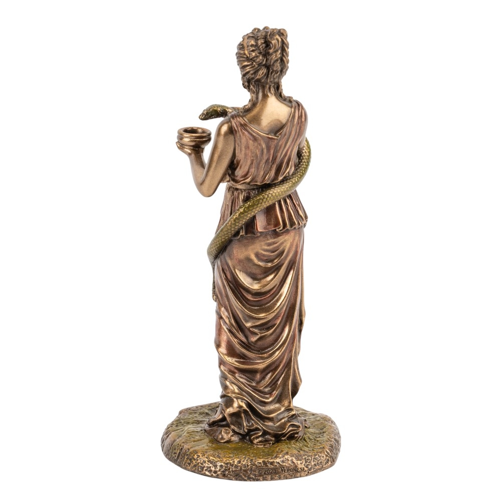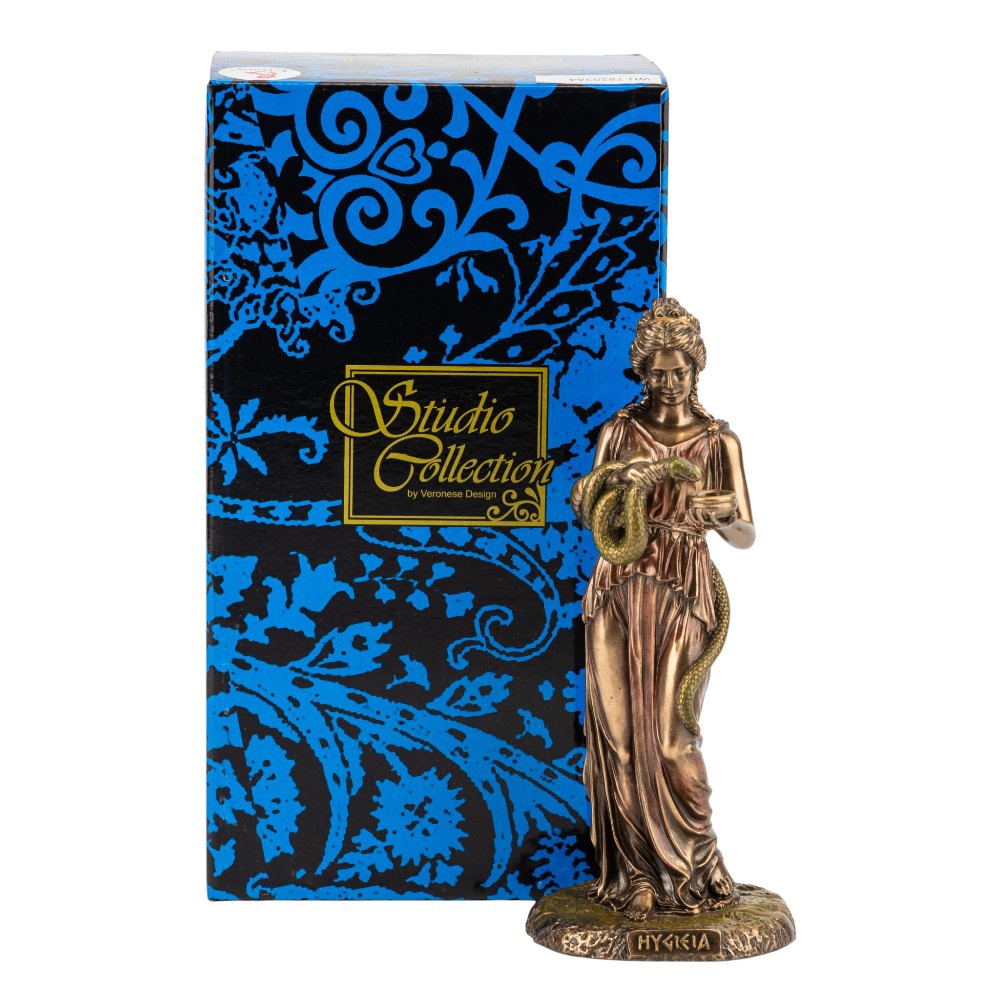 Висота статуетки — 15,5 см, ширина — 6,5 см. Статуетка Veronese виготовлена з полістоуну — штучного каменю. Запакована в подарункову коробку. Упаковка з пінопласту з індивідуальними поглибленнями для кожного елемента забезпечує максимальний захист товару під час транспортування. Статуетка "Гігея. Богиня здоров'я" є символом чистоти, профілактики та гармонії. Богиня Гігіея зображена у довгій туніці, тримаючи в руках чашу, з якої п'є змія — цей образ став всесвітньо відомим символом фармації та медицини. Витончена фігура, виконана з якісного полістоуну з деталізованим бронзовим напиленням, підкреслює грацію та благородність міфологічної богині. Цей витвір мистецтва несе глибокий сенс, нагадуючи про важливість здоров'я та гарного самопочуття. Статуетка стане вишуканим подарунком для лікарів, фармацевтів або всіх, хто цінує медицину та піклується про свій добробут.