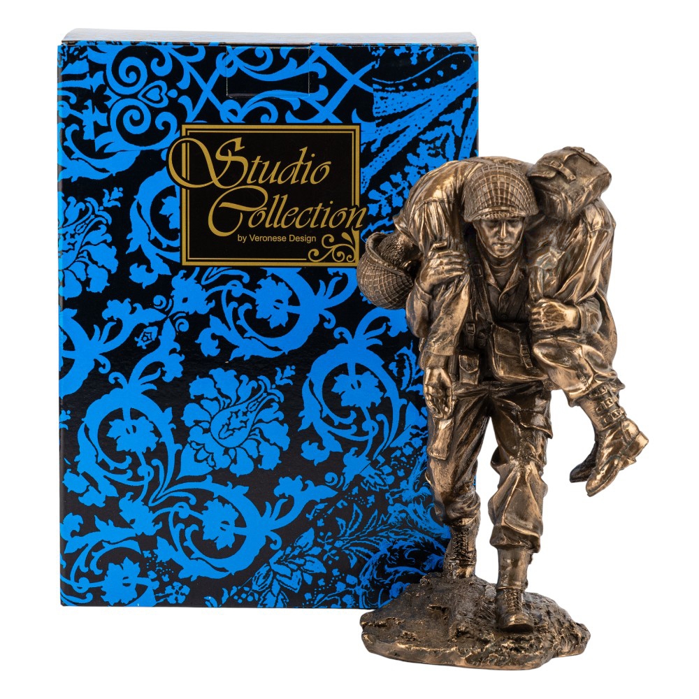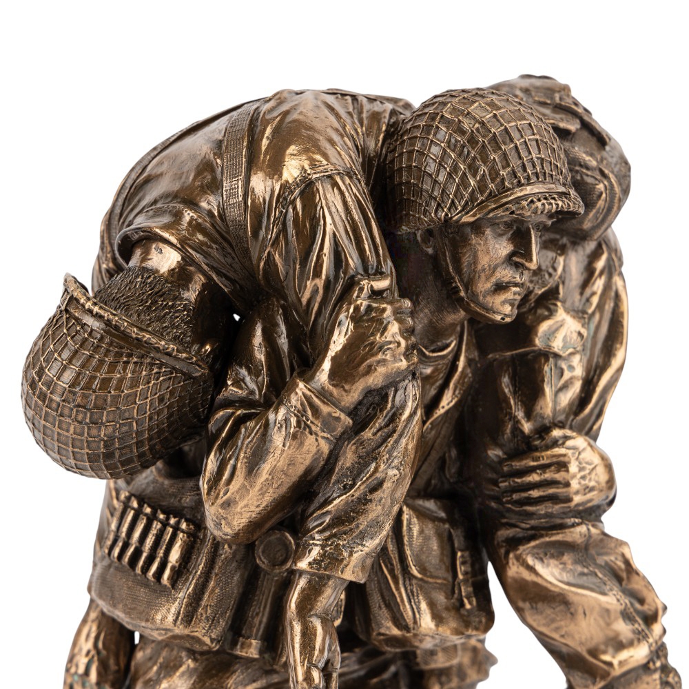 Висота статуетки — 23,5 см, довжина — 13,5 см, ширина — 11,5 см. Статуетка Veronese виготовлена з полістоуну — штучного каменю. Запакована в подарункову коробку. Упаковка з пінопласту з індивідуальними поглибленнями для кожного елемента забезпечує максимальний захист товару під час транспортування. Ця надзвичайно потужна статуетка від Veronese увічнила один із найважливіших принципів військового життя: незламне братерство та взаємовиручку. Скульптура зображує військового, який рішуче несе на своїх плечах пораненого товариша, символізуючи жертовність та вірність обов'язку до кінця. Кожна деталь, від обличчя, сповненого рішучості, до військової амуніції, виконана з найвищою точністю завдяки бронзовому напиленню. Ця фігура є монументальним нагадуванням про ціну миру та справжню чоловічу дружбу, яка не знає страху. Це глибоко символічний подарунок для ветеранів, військовослужбовців, лікарів-рятувальників та всіх, хто цінує самовідданість та честь.