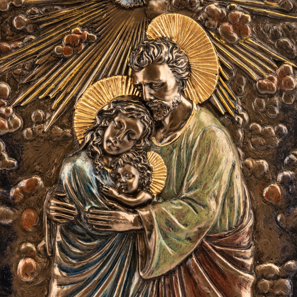 Висота — 23 см, довжина — 15 см, ширина — 1,5 см. Картина Veronese виготовлена з полістоуну — штучного каменю. Запакована в подарункову коробку. Упаковка з пінопласту з індивідуальними поглибленнями для кожного елемента забезпечує максимальний захист товару під час транспортування. Це величне настінне панно-барельєф від Veronese є зворушливим зображенням Святої Родини — Ісуса, Марії та Йосипа, об'єднаних у теплій обіймі. Композиція майстерно передає ідеал сімейної любові та захисту, підкреслений німбами та символом Святого Духа (голубом) у променях світла. Барельєф виконаний із полістоуну і покритий високоякісним бронзовим напиленням із кольоровими акцентами, що робить його винятково живим. Завдяки об'ємному виконанню та вишуканій рамці, панно виглядає як справжній витвір мистецтва на стіні. Це знаковий подарунок для молодої родини, на хрестини, весілля або як потужний оберіг для сімейного благополуччя.