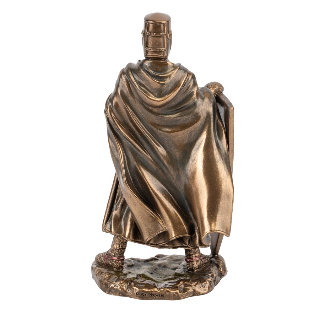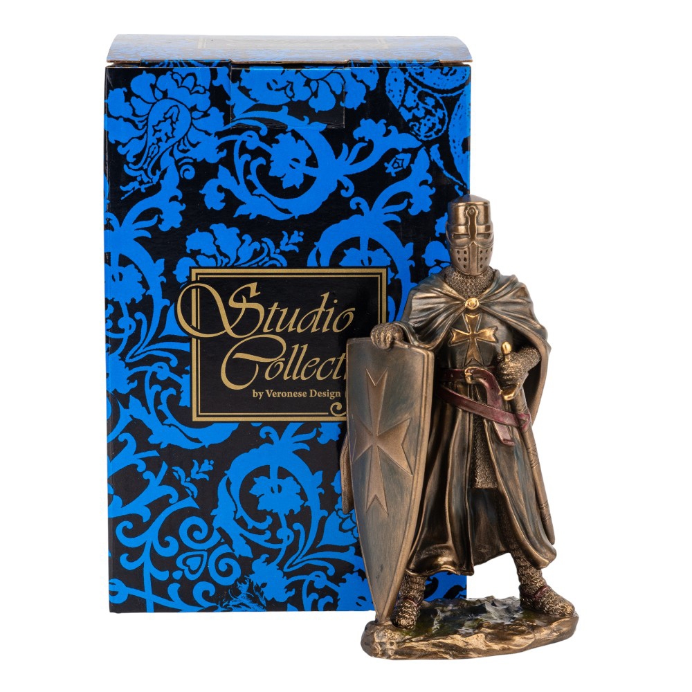 Висота статуетки — 15,5 см, ширина — 7 см. Статуетка Veronese виготовлена з полістоуну — штучного каменю. Запакована в подарункову коробку. Упаковка з пінопласту з індивідуальними поглибленнями для кожного елемента забезпечує максимальний захист товару під час транспортування. Ця статуетка від Veronese втілює образ Лицаря-Хрестоносця — символ духовної сили та військової мужності Середньовіччя. Фігура зображена у повних латах і довгій накидці, яка надає образу таємничості та величі. Лицар стоїть, притуливши до себе великий щит, прикрашений хрестом, що символізує його незламну віру та готовність до захисту. Скульптура виконана з полістоуну з високоякісним бронзовим напиленням, яке детально передає фактуру кольчуги та лат. Це винятковий подарунок для колекціонерів, істориків та всіх, хто цінує символи непохитності, честі та вірності своїм ідеалам.