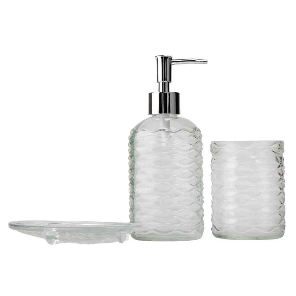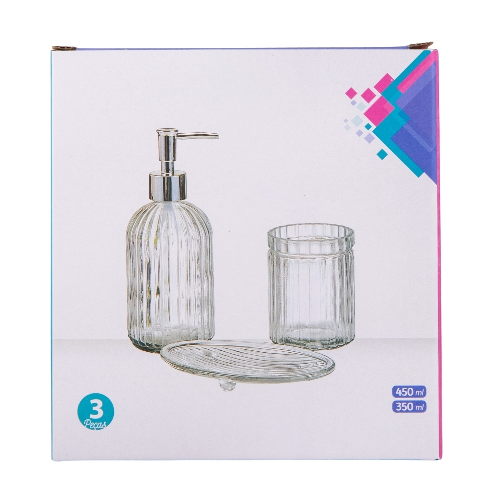 Висота диспенсера - 19 см, діаметр - 7,5 см. Висота склянки - 10 см, діаметр - 7,5 см. Ширина мильниці - 9,8 см, довжина - 15 см, висота - 2 см. Елегантний набір для ванної кімнати: забезпечте комфорт та стиль вашого простору! Набір для ванної кімнати складається з вишуканої комбінації диспенсера, мильниці та зручної склянки, створюючи гармонійне та практичне середовище для вашої ванної кімнати. Особливості набору для ванної кімнати: функціональний дизайн, якість та довговічність, проста установка, легкість обслуговування та стильне оформлення. Зробіть вашу ванну кімнату оазисом комфорту та гармонії! Створіть простір, де функціональність зустрічається з елегантністю, даруючи вам комфорт та задоволення в кожному дотику.
