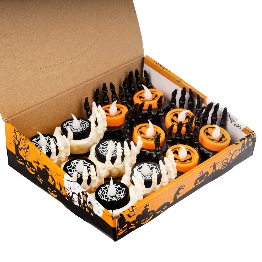 Висота - 5 см, ширина - 5 см. В упаковці 12 шт. Батарейки у комплекті. Свічки LED у вигляді руки скелета — ідеальний акцент для створення моторошної, але атмосферної подачі в декорі. Свічки випромінюють м’яке тепле світло, що чудово пасує до тематичних вечірок, вітрин, фотозон і святкового сервірування. Оригінальний дизайн робить їх справжнім хелловінським must-have. Можна використовувати багаторазово.