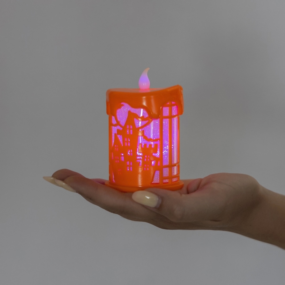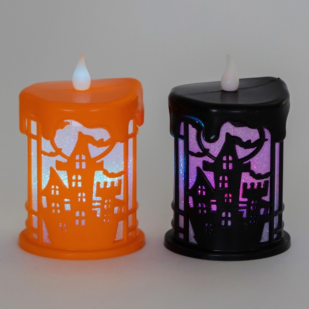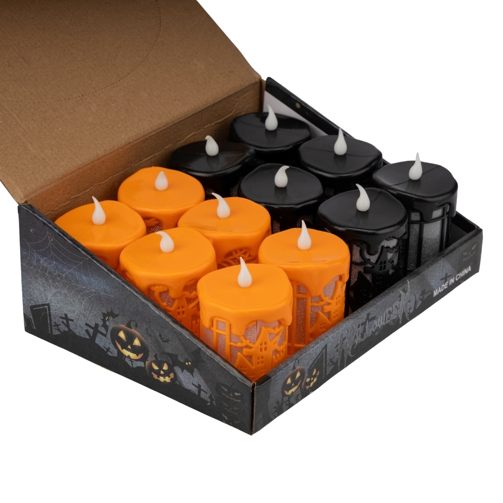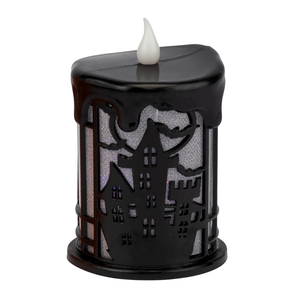 Висота - 9,5 см, діаметр - 6 см. В упаковці 12 шт. Батарейки у комплекті. Світлодіодні свічки з мерехтливим ефектом і вирізним дизайном у вигляді моторошного замку з кажанами. Ідеально підходять для створення атмосферного декору на Хелловін або тематичну вечірку. Безпечні у використанні, працюють від батарейок, не потребують відкритого вогню.
