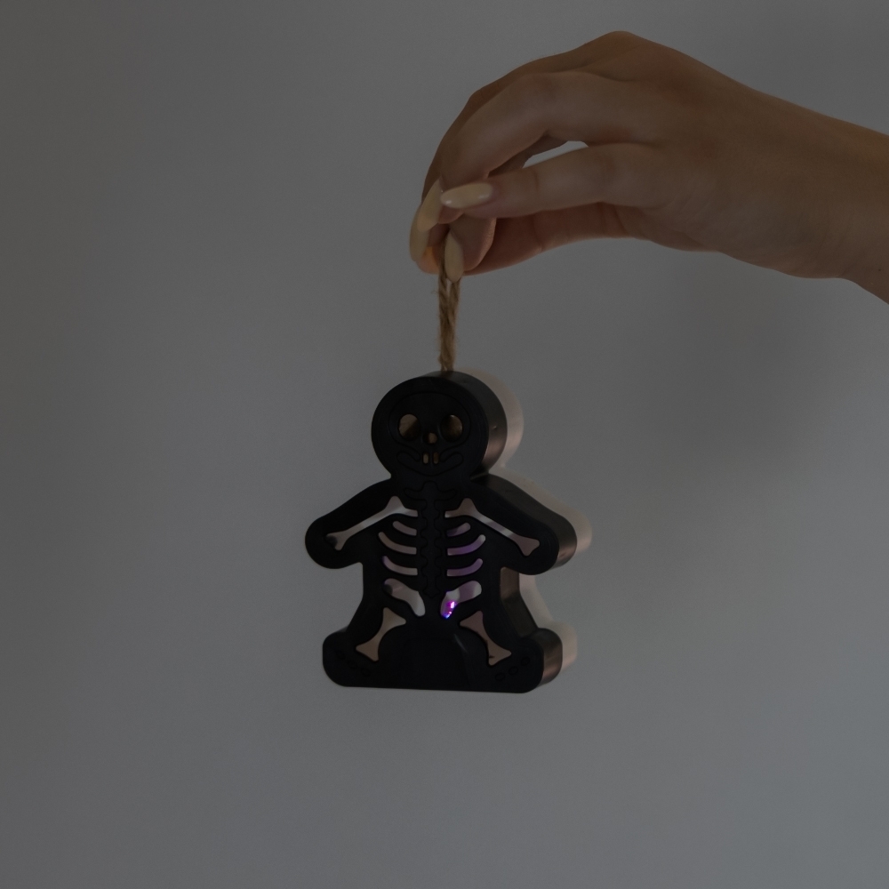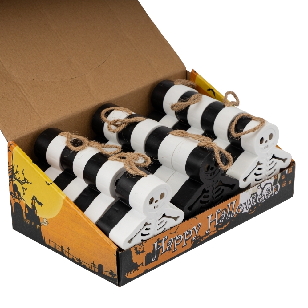 Висота - 10 см, ширина - 4 см, довжина - 8 см. В упаковці 12 шт. Батарейки у комплекті. Світлодіодна підвіска у вигляді скелета — стильний і яскравий елемент для святкування Хелловіну. З одного боку підвіска біла, а з іншого — чорна, що дозволяє створювати різні варіанти декору. Завдяки зеленому підсвічуванню вона створює ефектну атмосферу та стане чудовою прикрасою для будинку, вхідних дверей або тематичної фотозони. Легка у використанні та безпечна, ця підвіска стане улюбленим елементом декору на святі.
