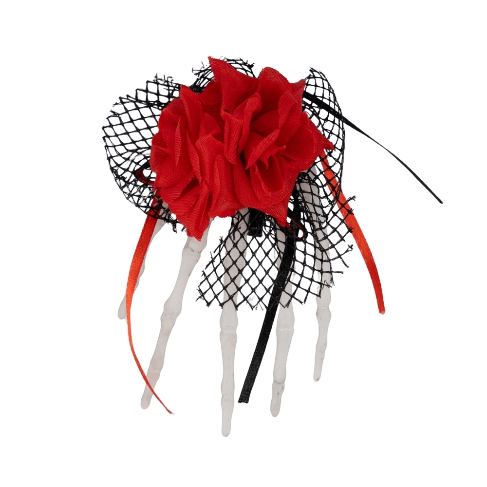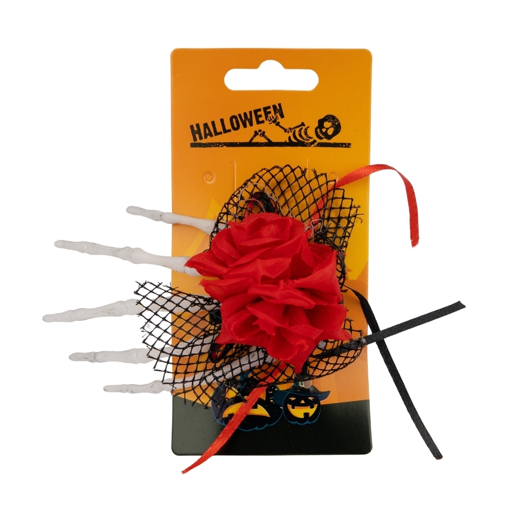 Довжина - 10,5 см, ширина - 7 см. Декор до Хелловіну “Рука з трояндою” — стильний та моторошний аксесуар, який додасть образу загадковості й ефектності. Композиція з червоної троянди, чорно-червоної сіточки та білої кістлявої руки створює яскравий акцент, що точно приверне увагу. Легка та зручна у використанні — ідеально підходить для тематичних вечірок, костюмованих свят, фотосесій або сценічних виступів. Такий аксесуар легко доповнить образ відьми, вампірки, готичної нареченої чи іншого персонажа Хелловіну.