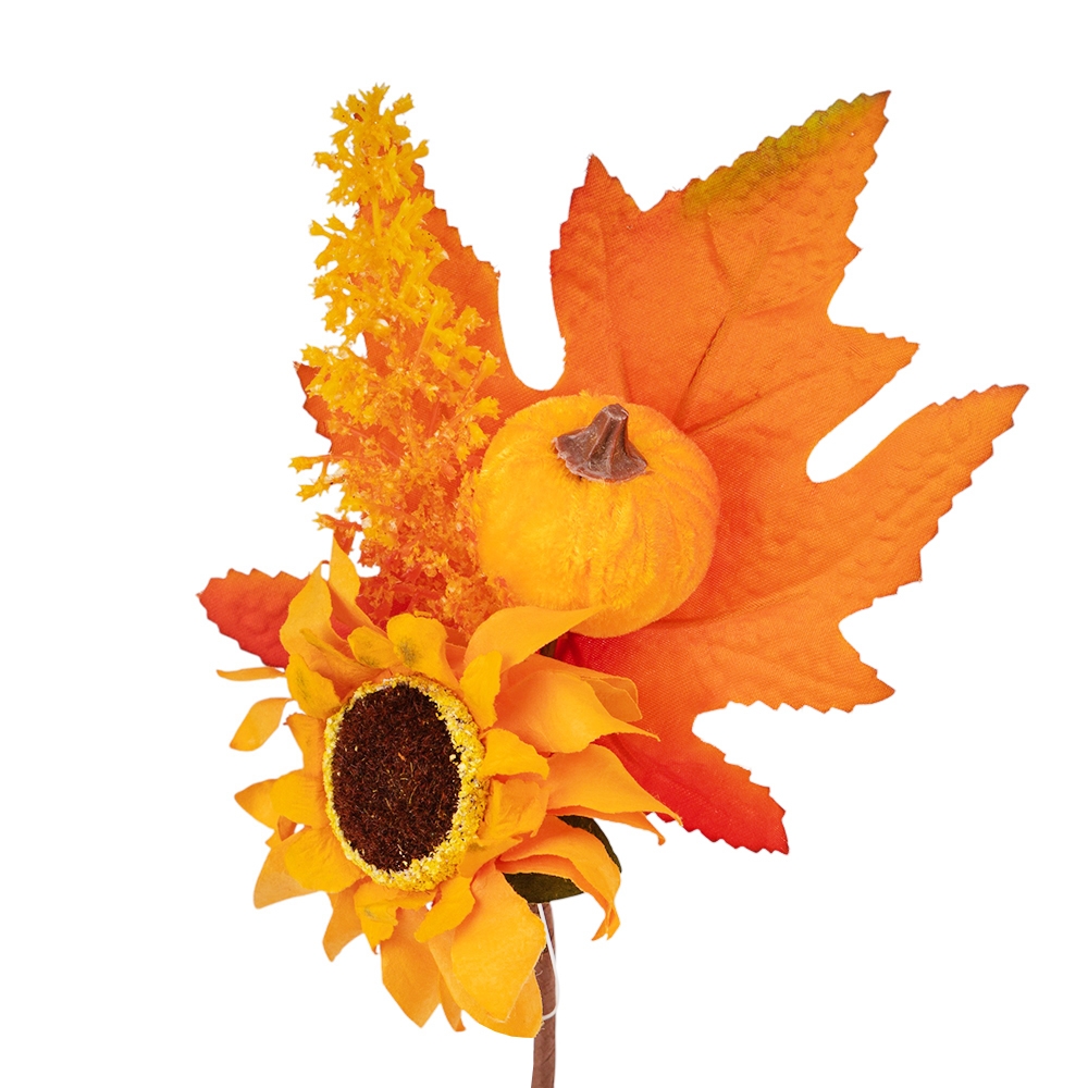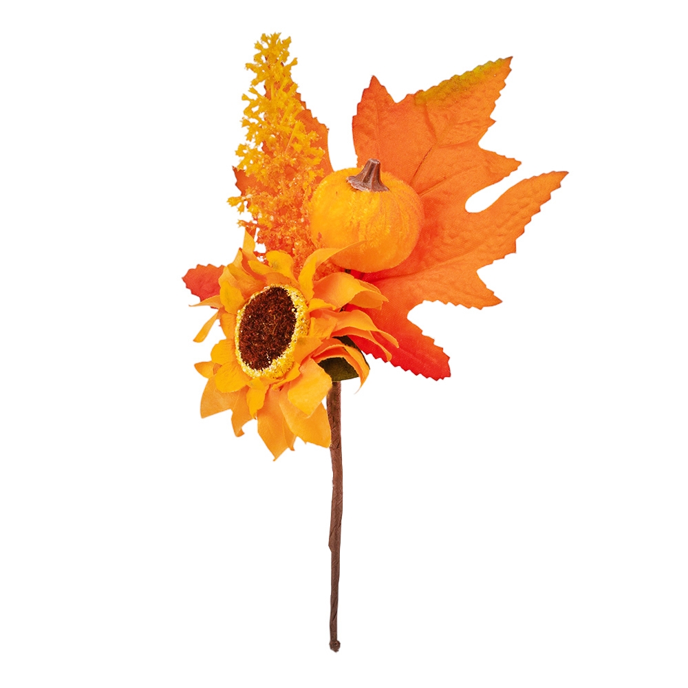 Штучна гілка висотою 22 см із яскравим соняшником, доповненим ягодами та осіннім листям. Кольори від насиченого жовтого до теплих коричневих створюють атмосферу затишку. Відмінно підходить для сезонного оформлення HoReCa, декору вітрин та фотозон.