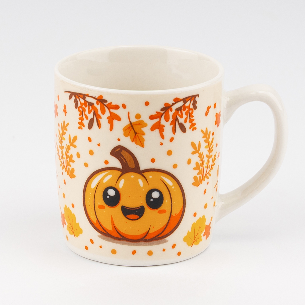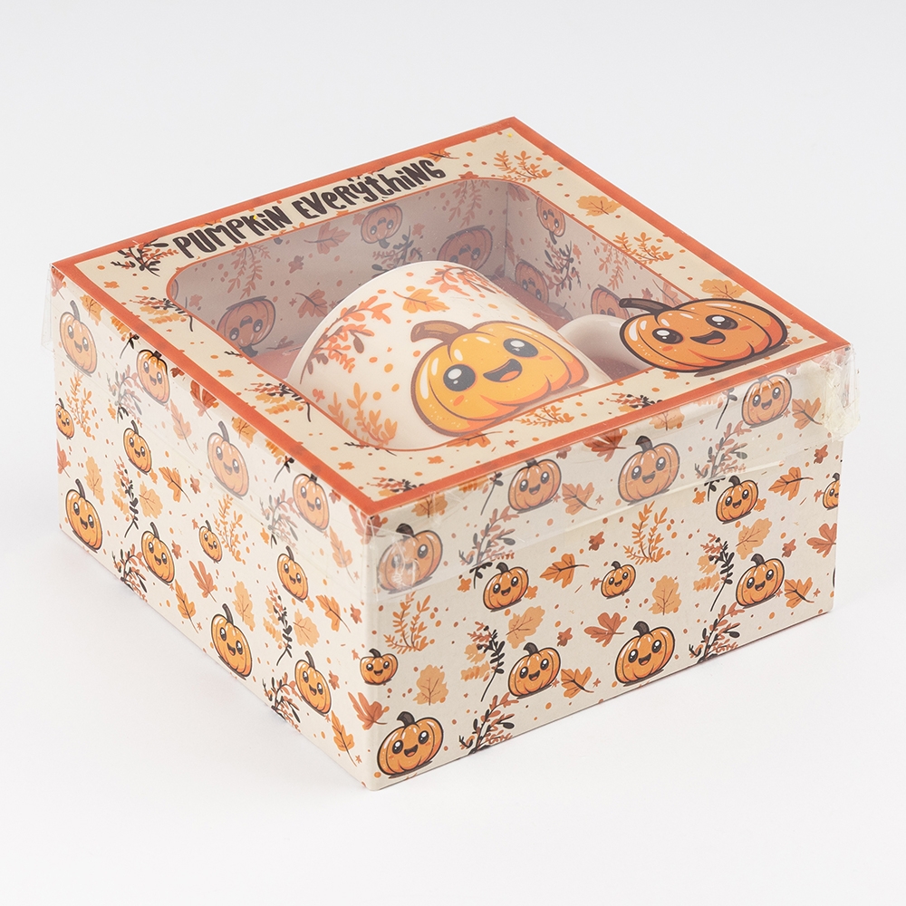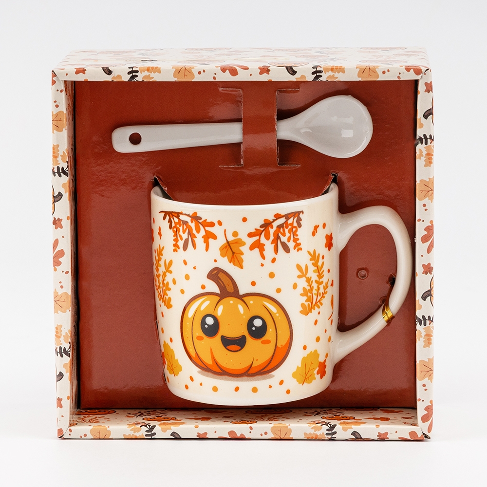 Керамічна кружка з ложечкою на тему Хелловіну оформлена яскравим принтом із гарбузиками та поставляється у подарунковому пакуванні з прозорим віконцем. Обʼєм 200 мл підходить для чаю, кави чи какао, ложечка зручно кріпиться в ручці. Такий набір стане актуальним подарунком у сезон осінніх свят або стильним доповненням до тематичного декору. Підходить для роздрібного продажу, кафе, магазинів подарунків і HoReCa.