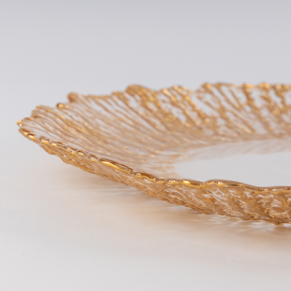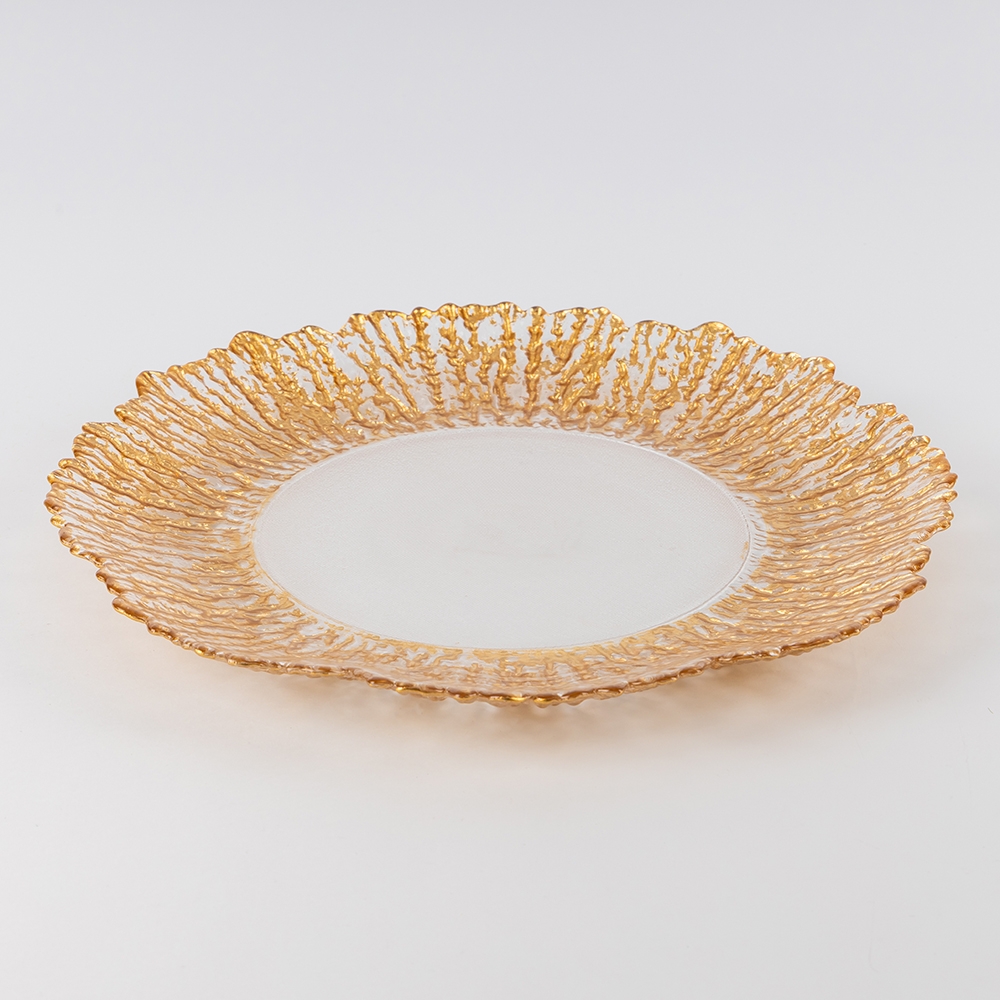 Діаметр тарілки - 33 см, висота - 3 см. Скляна золота тарілка – це витончений елемент сервірування, який додасть розкоші будь-якому столу. Виготовлена з високоякісного прозорого скла, тарілка має делікатне золотисте оздоблення, що створює елегантний та вишуканий вигляд. Вона ідеально підходить для святкових заходів, весільних банкетів чи урочистих вечерь, де важливо підкреслити особливу атмосферу. Завдяки своєму діаметру, тарілка є достатньо великою для сервірування головних страв або як підставка під інші посудини, надаючи столу завершеного вигляду.
