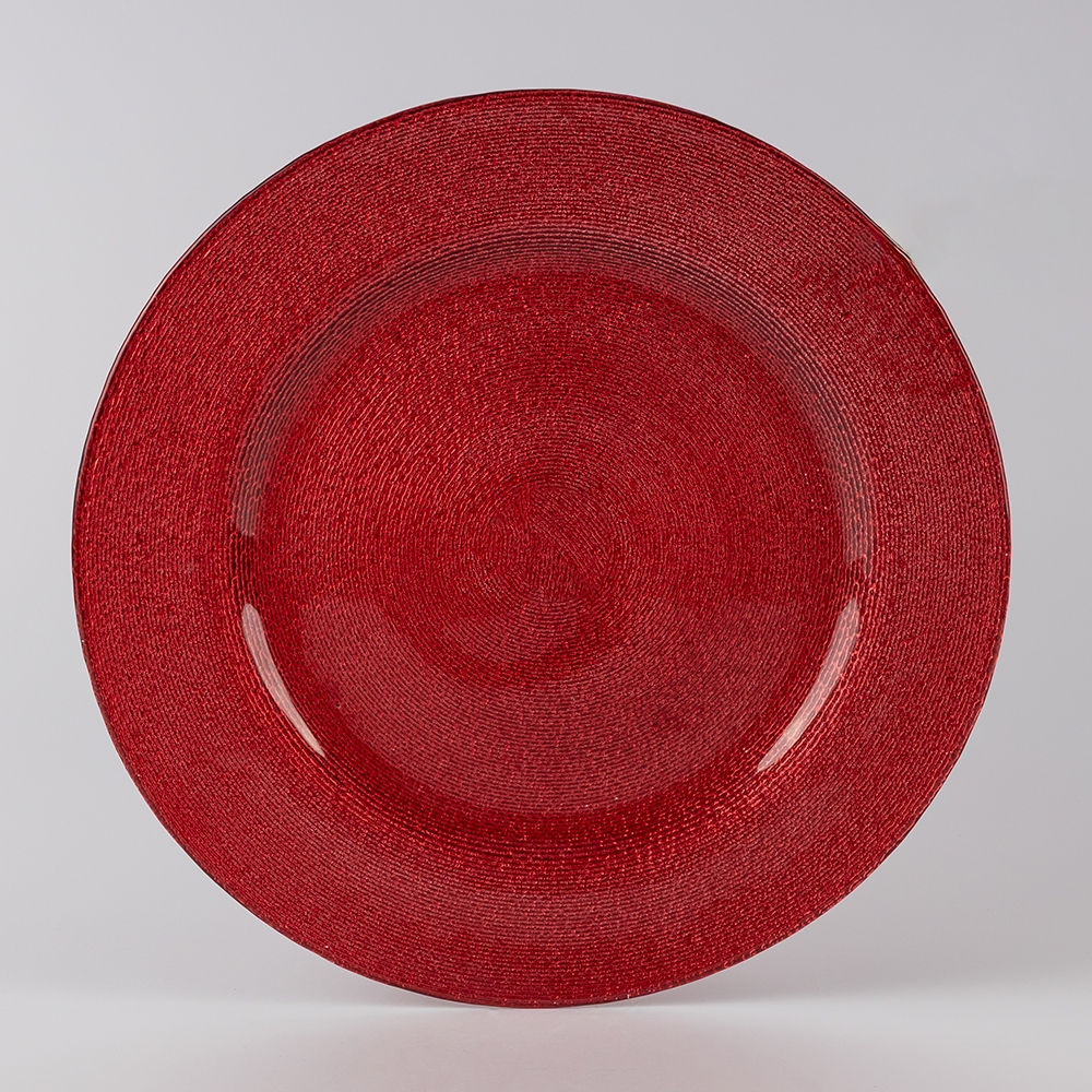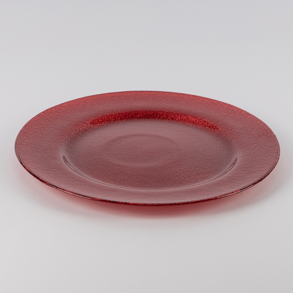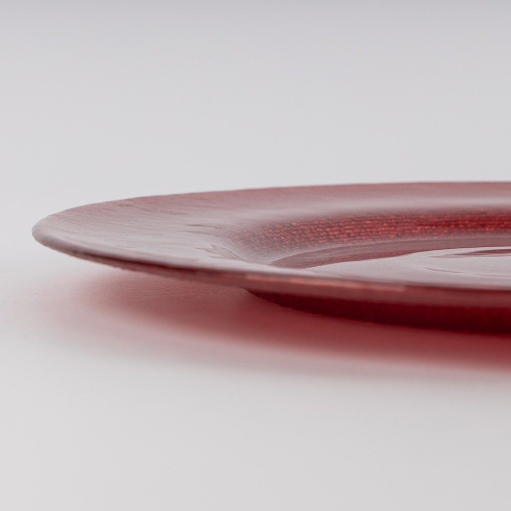 Діаметр тарілки - 33,5 см, висота - 2,5 см. Декоративна скляна тарілка вишуканого червоного кольору з іскристим напиленням. Її насичений відтінок додає емоційності та вишуканості будь-якому святковому столу. Ідеально підходить для весіль, вечірніх заходів, бенкетів та особливих подій з акцентом на стиль і деталі.