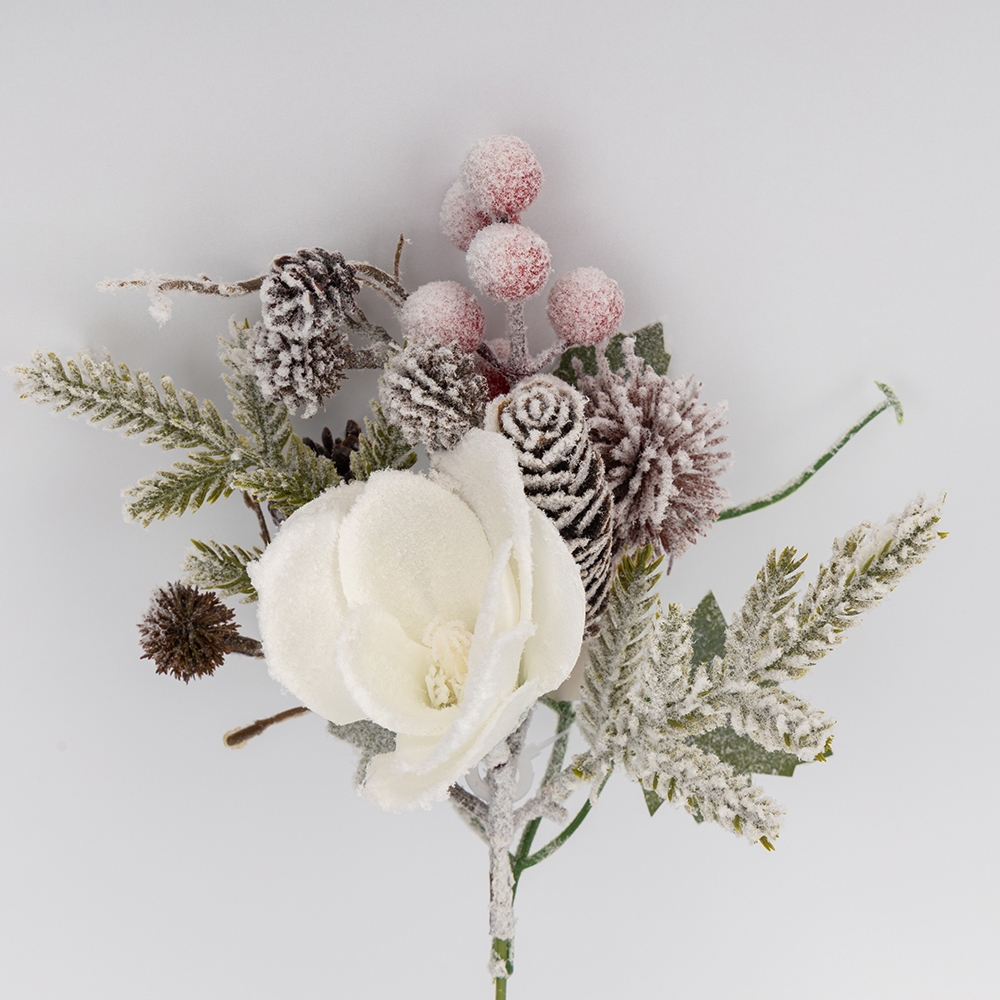 Висота гілки - 35 см, ширина - 15 см. Діаметр магнолії - 8 см. Ця вишукана гілка з елементами магнолії та засніженими шишками створить чарівну атмосферу свята. Прикраса виготовлена з якісних матеріалів, що імітують природні елементи, і ідеально підійде для створення новорічних композицій. Завдяки реалістичному вигляду та дбайливо продуманим деталям, вона стане справжнім акцентом у будь-якому інтер'єрі. Використовуйте її для декорування ялинки, вінків, букетів або як самостійний елемент оформлення.