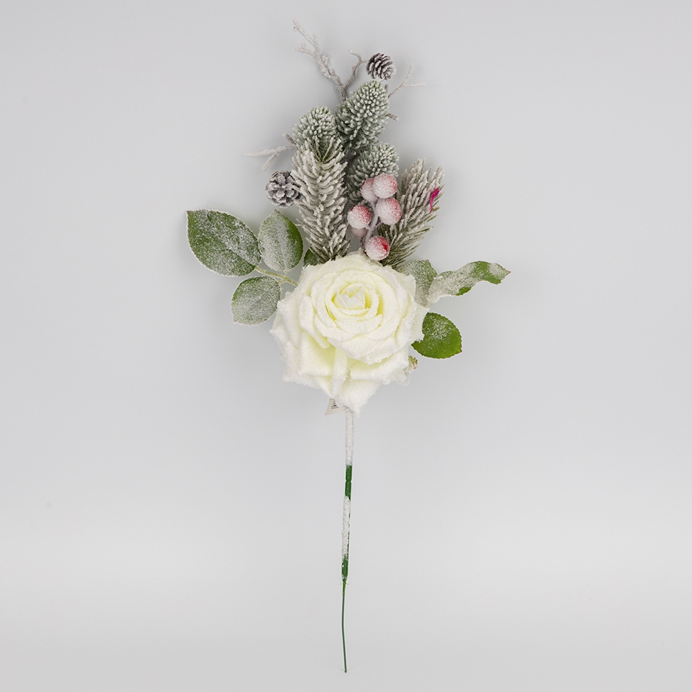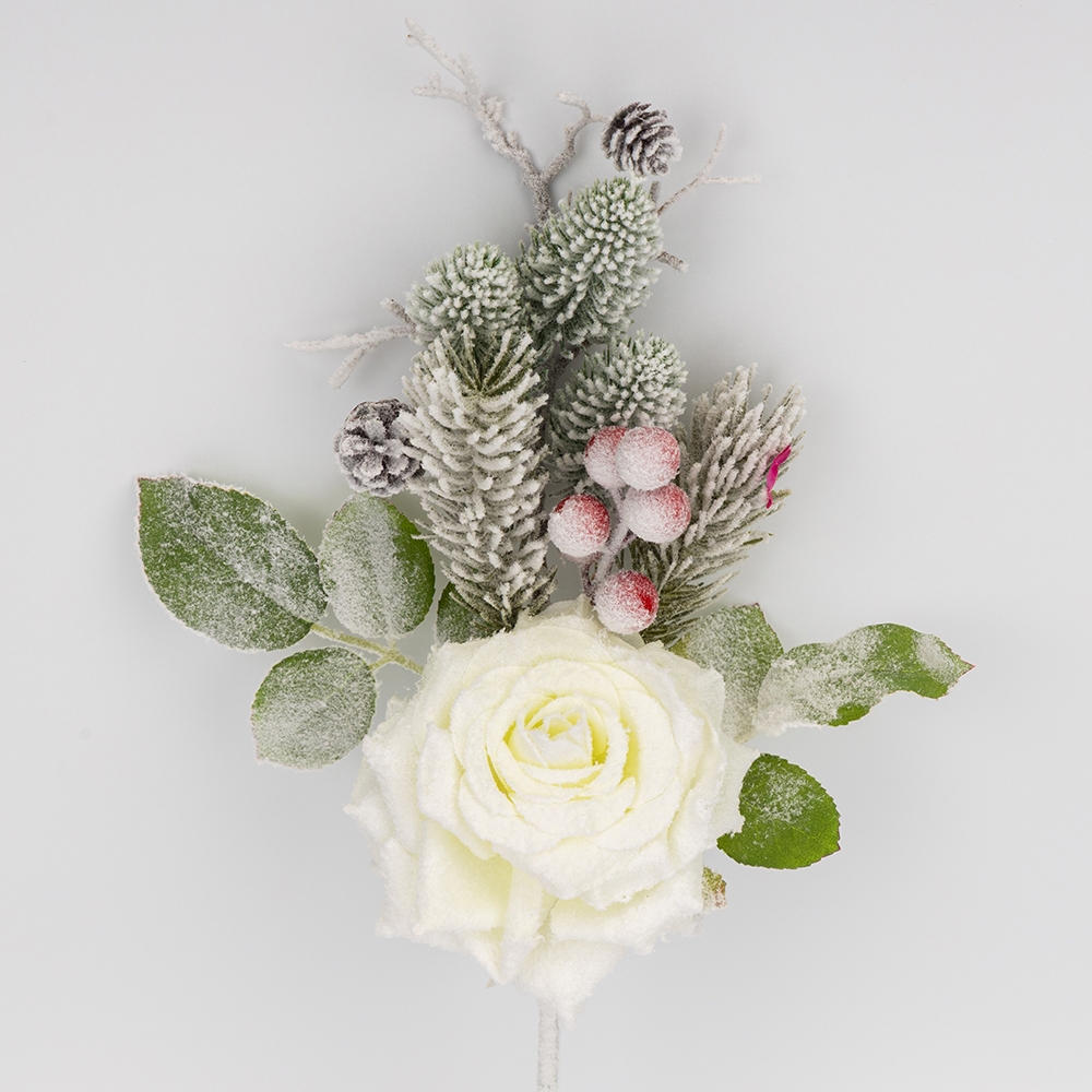 Висота гілки - 47 см, ширина - 20 см. Діаметр троянди - 10 см. Ця вишукана гілка з елементами троянди та засніженою хвоєю створить чарівну атмосферу свята. Прикраса виготовлена з якісних матеріалів, що імітують природні елементи, і ідеально підійде для створення новорічних композицій. Завдяки реалістичному вигляду та дбайливо продуманим деталям, вона стане справжнім акцентом у будь-якому інтер'єрі. Використовуйте її для декорування ялинки, вінків, букетів або як самостійний елемент оформлення.