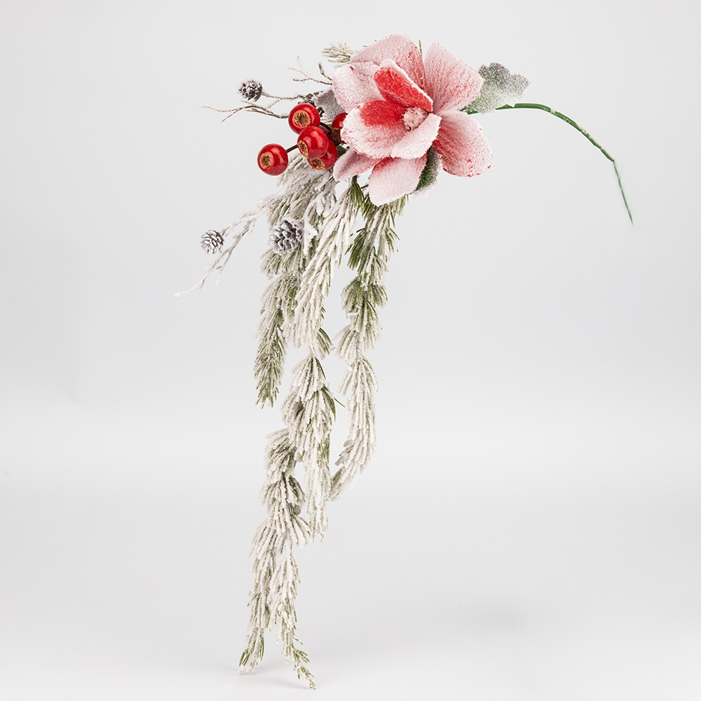 Довжина гілки - 73 см, ширина - 25 см. Діаметр магнолії - 15 см, ягідок - 2,5 см. Ця елегантна звисаюча гілка ідеально підходить для створення динамічних та витончених новорічних композицій. Вона поєднує в собі розкішну магнолію та засніжені хвойні гілки, які спадають донизу, створюючи ефектний каскад. Прикраса доповнена мініатюрними шишками та ягодами, покритими інеєм, що додає їй природної чарівності та зимового настрою. Гілка чудово виглядатиме на ялинці, як елемент дверного вінка або як самостійна підвісна прикраса. Завдяки реалістичному вигляду та гнучкій основі, вона дозволяє створювати унікальні дизайни, що перетворять ваш простір на справжню зимову казку.