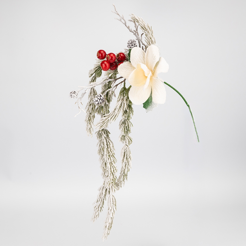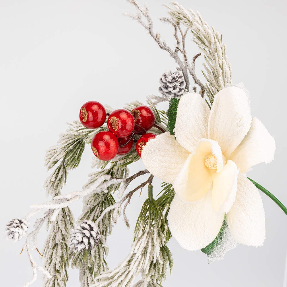 Довжина гілки - 73 см, ширина - 25 см. Діаметр магнолії - 15 см, ягідок - 2,5 см. Ця елегантна звисаюча гілка ідеально підходить для створення динамічних та витончених новорічних композицій. Вона поєднує в собі розкішну магнолію та засніжені хвойні гілки, які спадають донизу, створюючи ефектний каскад. Прикраса доповнена мініатюрними шишками та ягодами, покритими інеєм, що додає їй природної чарівності та зимового настрою. Гілка чудово виглядатиме на ялинці, як елемент дверного вінка або як самостійна підвісна прикраса. Завдяки реалістичному вигляду та гнучкій основі, вона дозволяє створювати унікальні дизайни, що перетворять ваш простір на справжню зимову казку.