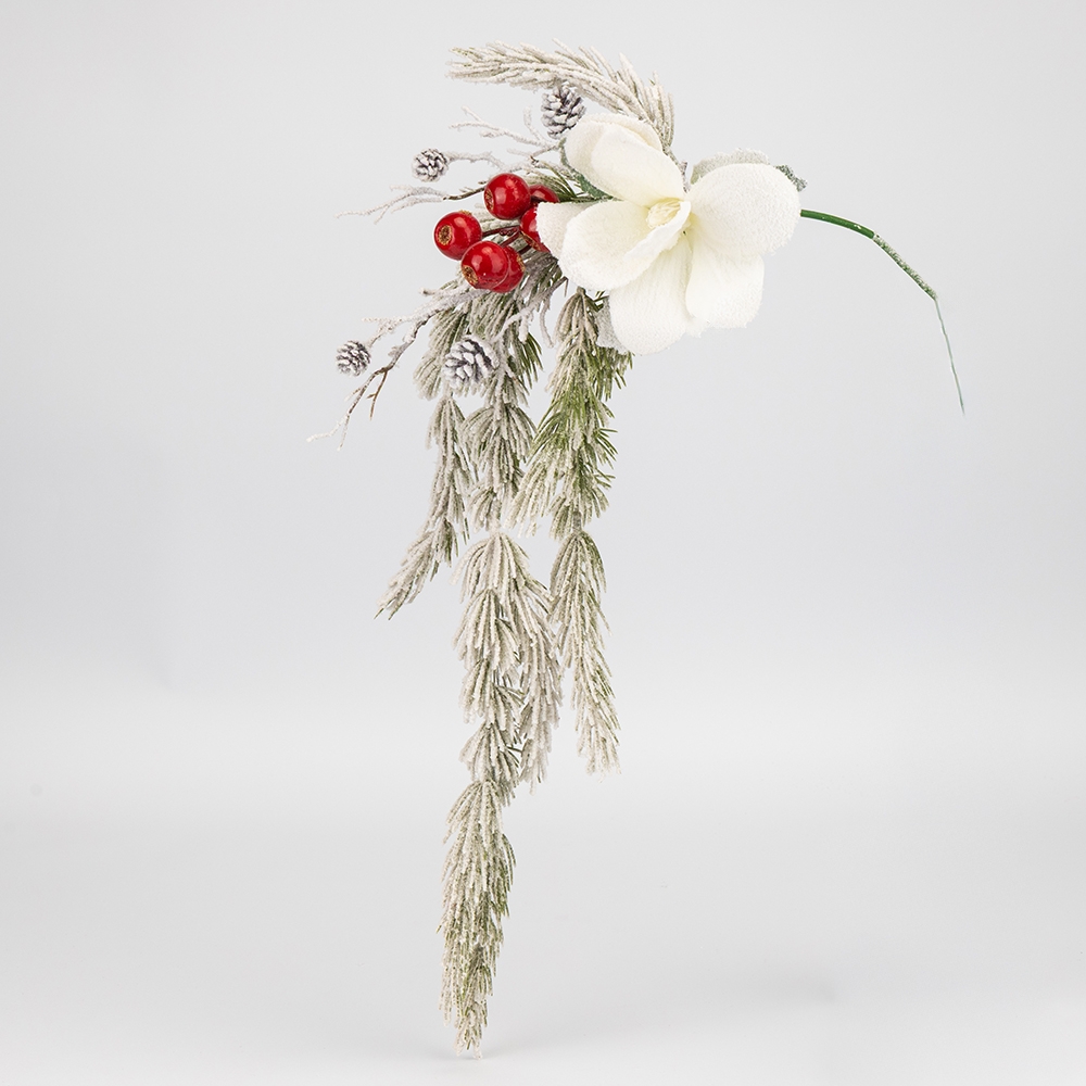 Довжина гілки - 73 см, ширина - 25 см. Діаметр магнолії - 15 см, ягідок - 2,5 см. Ця елегантна звисаюча гілка ідеально підходить для створення динамічних та витончених новорічних композицій. Вона поєднує в собі розкішну магнолію та засніжені хвойні гілки, які спадають донизу, створюючи ефектний каскад. Прикраса доповнена мініатюрними шишками та ягодами, покритими інеєм, що додає їй природної чарівності та зимового настрою. Гілка чудово виглядатиме на ялинці, як елемент дверного вінка або як самостійна підвісна прикраса. Завдяки реалістичному вигляду та гнучкій основі, вона дозволяє створювати унікальні дизайни, що перетворять ваш простір на справжню зимову казку.