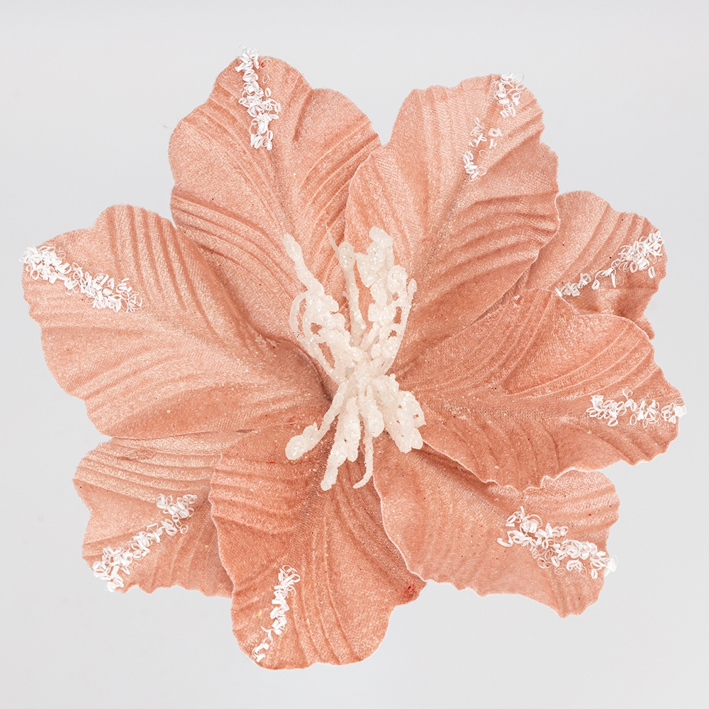 Висота - 25 см, діаметр - 20 см. Пелюстки гнучкі. Декоративна яскрава квітка Пуансетія — це ефектний елемент святкового декору, що привертає увагу своїм розкішним сяйвом і витонченим дизайном. Пелюстки, вкриті блискітками, переливаються в світлі, створюючи яскраве мерехтіння, яке додає квітці елегантності й святкового настрою. Така квітка стане чудовим доповненням до святкових вінків, ялинкових прикрас або центральних композицій на столі. Вона ідеально підійде для прикрашання фотозон, святкових інтер’єрів, або для додавання розкоші в будь-яку новорічну композицію.