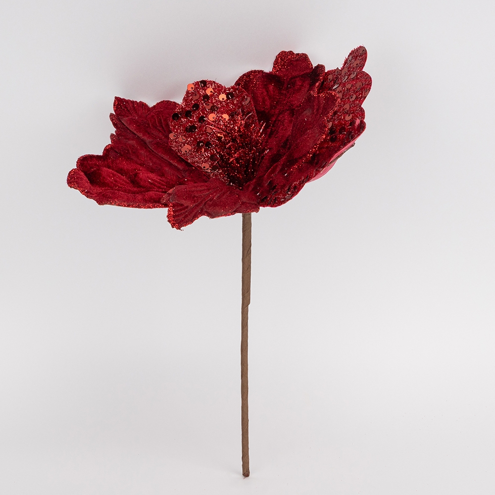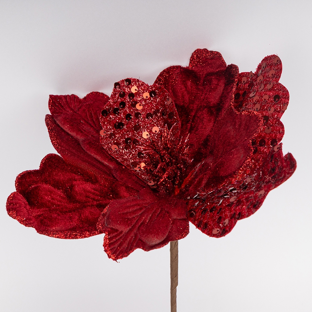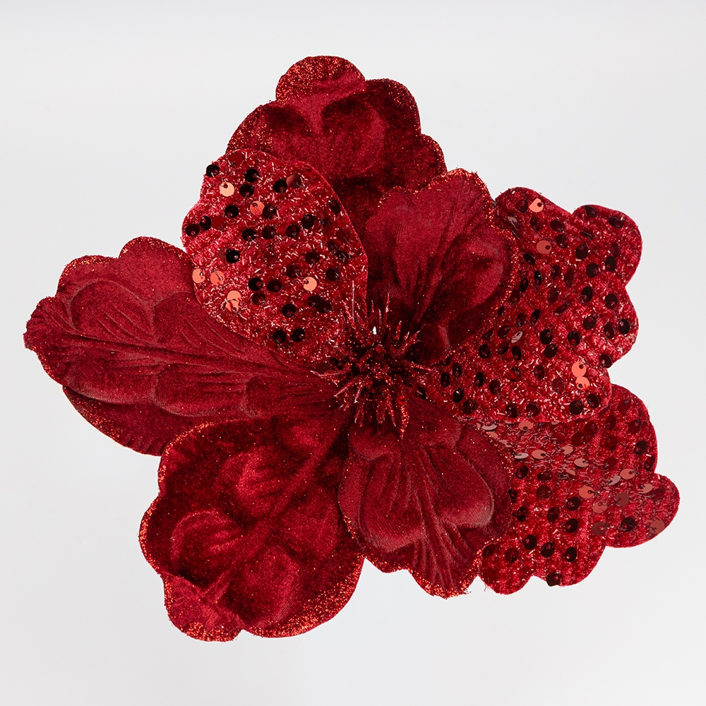 Висота - 25 см, діаметр - 25 см. Пелюстки гнучкі. Декоративна яскрава квітка Пуансетія — це ефектний елемент святкового декору, що привертає увагу своїм розкішним сяйвом і витонченим дизайном. Пелюстки, вкриті блискітками, переливаються в світлі, створюючи яскраве мерехтіння, яке додає квітці елегантності й святкового настрою. Така квітка стане чудовим доповненням до святкових вінків, ялинкових прикрас або центральних композицій на столі. Вона ідеально підійде для прикрашання фотозон, святкових інтер’єрів, або для додавання розкоші в будь-яку новорічну композицію.