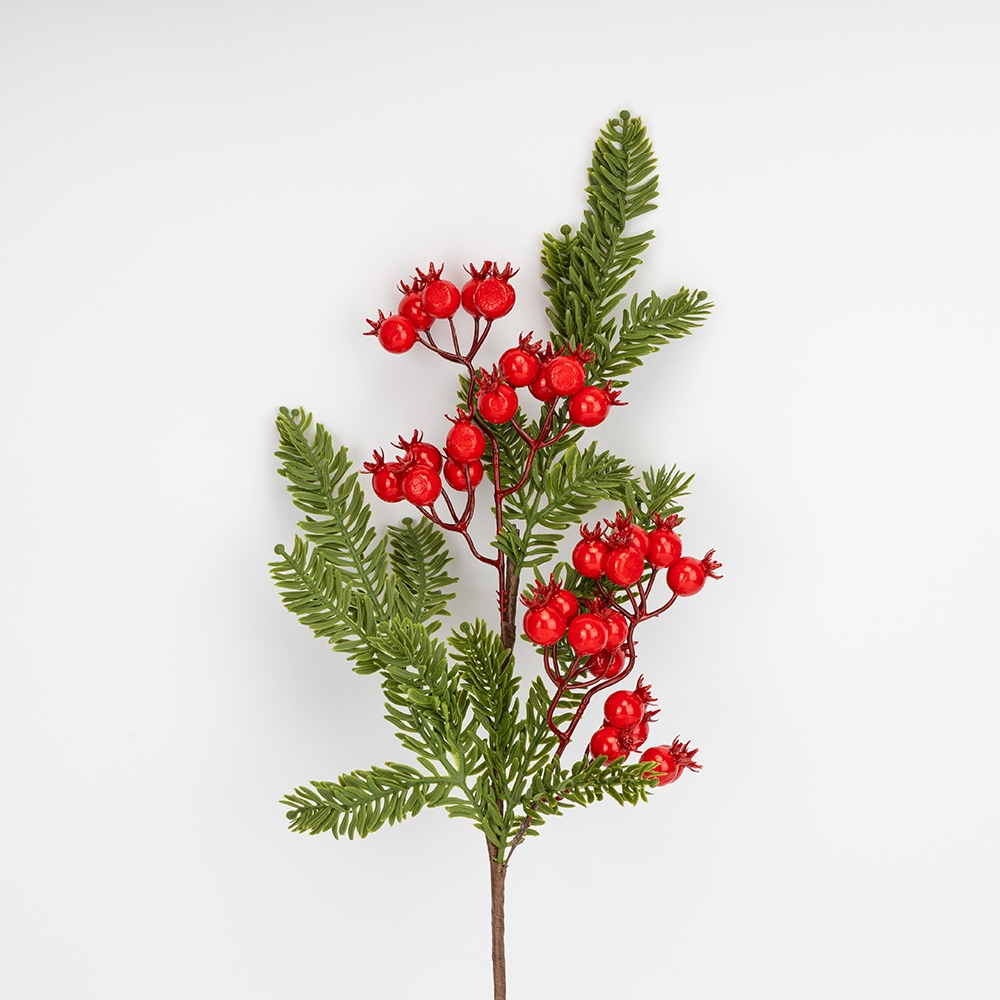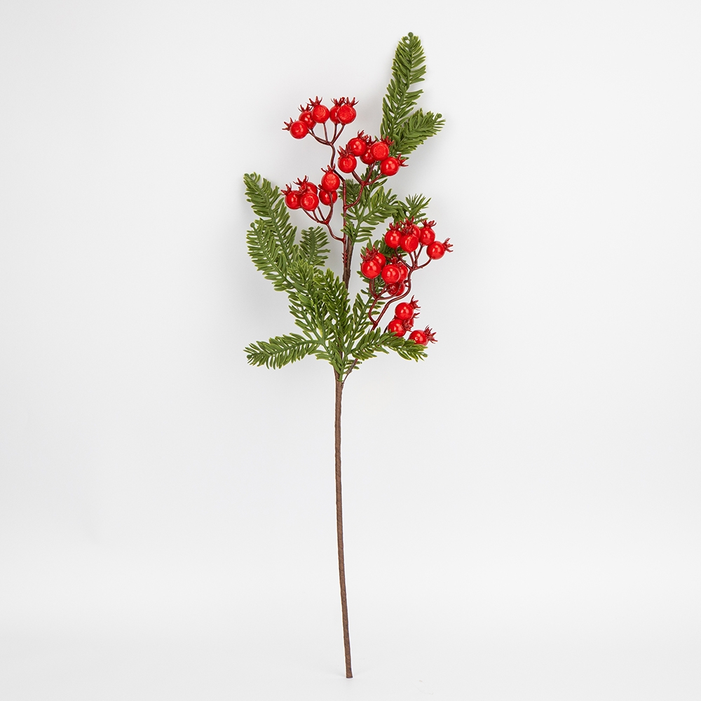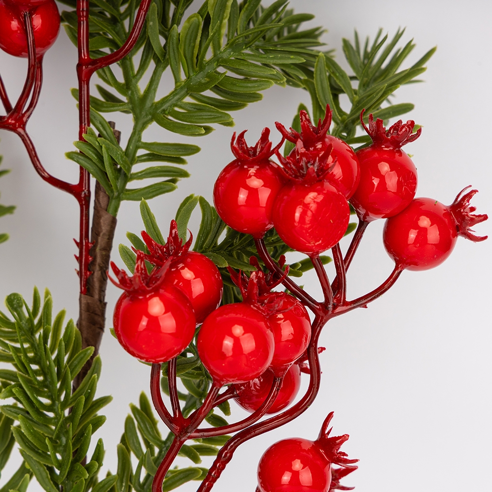 Висота гілки - 60 см. Діаметр ягідок - 2 см. Ця штучна хвойна гілка ідеально імітує живу рослину завдяки використанню латексу. Матеріал надає їй надзвичайної реалістичності: м'які та гнучкі голки приємні на дотик і мають природний вигляд. Гілка чудово тримає форму, не обсипається та не втрачає колір з часом, що робить її довговічним елементом декору. Це універсальне рішення для створення святкових композицій, букетів або вінків, що додає свіжості та природної краси без зайвого клопоту.