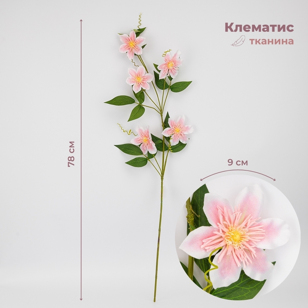 Висота – 78 см. Діаметр бутону - 9 см. Штучний клематис — елегантна декоративна квітка, яка вражає своєю реалістичністю та витонченістю. Великі квіти з ніжними пелюстками та природними вусиками створюють відчуття живої рослини. Такий клематис не потребує догляду, завжди зберігає свій бездоганний вигляд і стане чудовим вибором для декору інтер’єру, святкових фотозон, весіль та вітрин. Він додає простору легкості, гармонії та яскравого акценту.