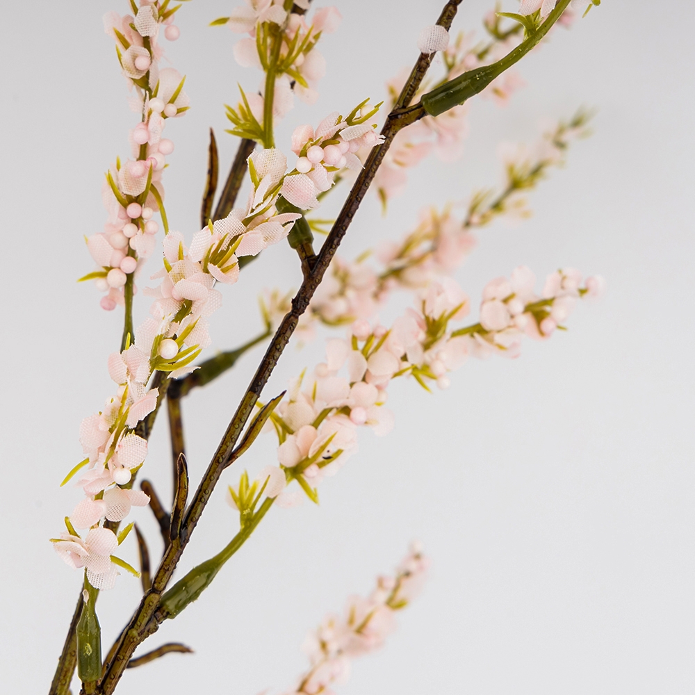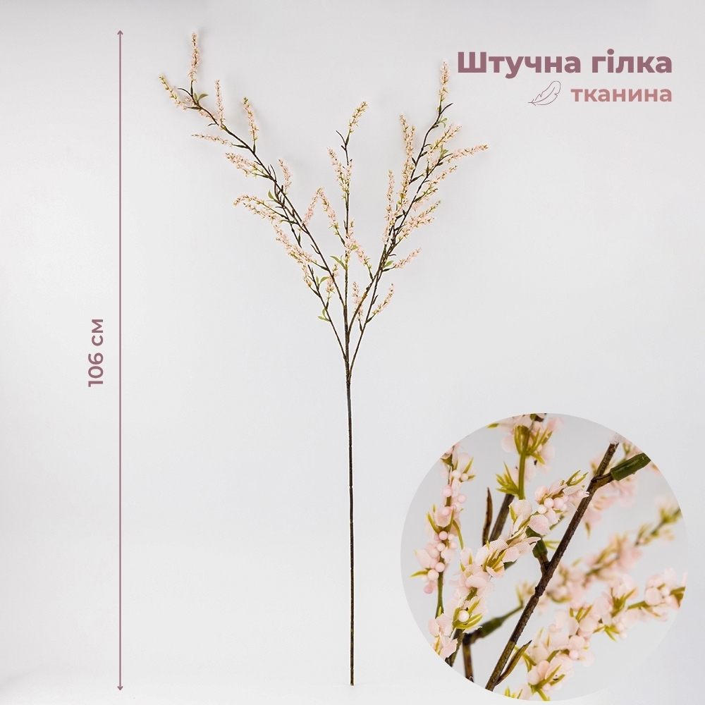 Висота – 106 см. Штучна квітуча гілка вирізняється ніжною текстурою та дрібними квітами, що створюють ефект природності. Завдяки делікатній деталізації та витонченій формі гілка стане стильним акцентом у будь-якому інтер’єрі. Ідеально підходить для HoReCa-проєктів, сезонного декору або оформлення фотозон. Гармонійно доповнить композиції у класичному чи сучасному стилі.
