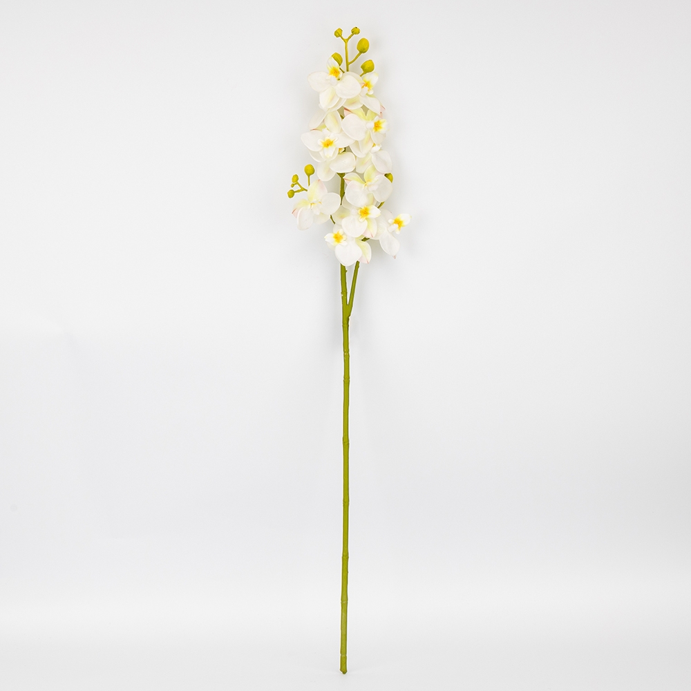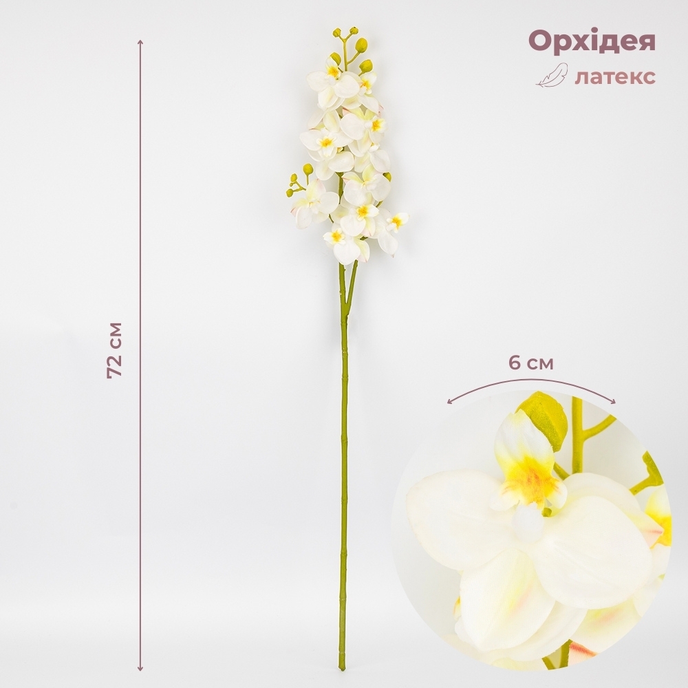 Зверніть увагу, що внаслідок недавньої атаки дронів частина партії має незначний аромат гарі, який повністю вивітрюється протягом короткого часу.Висота — 72 см, діаметр бутонів — 6 см. Квіти виконані з латексу, стебла - з пластику. Штучна гілка орхідеї з витонченими пелюстками та реалістичними бутонами додає елегантності будь-якому інтер’єру. Квітка має граційні вигини та деталізовану текстуру, що максимально наближена до живої рослини. Ідеально підходить для декору вітрин, ресторанів чи фотозон.