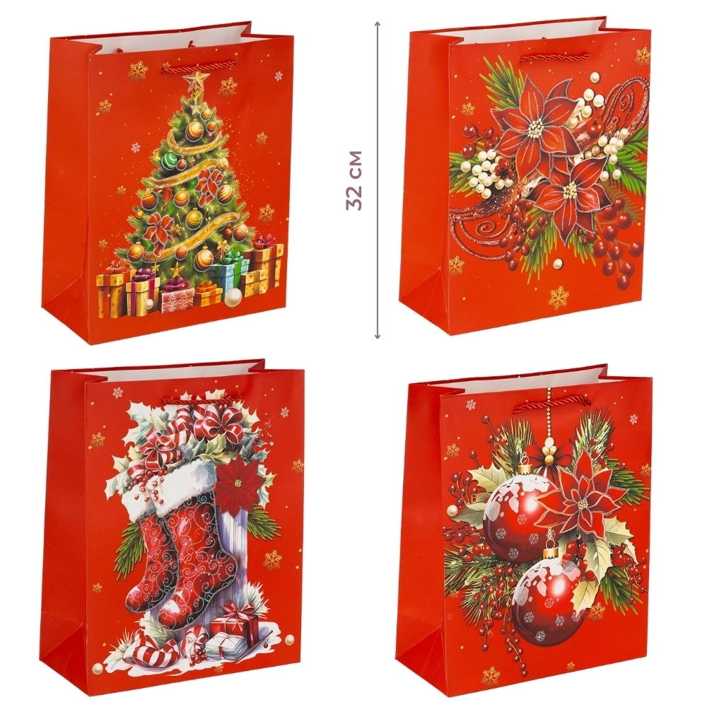 Висота - 32 см, довжина - 26 см, ширина - 12 см. В пакуванні 12 пакетів різного дизайну. Подарунковий пакет створює особливу атмосферу очікування і радості, підкреслюючи значення подарунка і роблячи його прийняття ще більш особливим і запам'ятовуваним. Паперовий матеріал додає легкості, але водночас забезпечує достатню міцність для перенесення подарунків. Цей пакет ідеально підходить для упаковки подарунків для близьких та друзів, даруючи їм теплі почуття святкової атмосфери. Красива новорічна тематика пакета не лише зробить його привабливим зовнішньо, але й створить настрій очікування та радості, відображаючи дух цього чарівного свята.