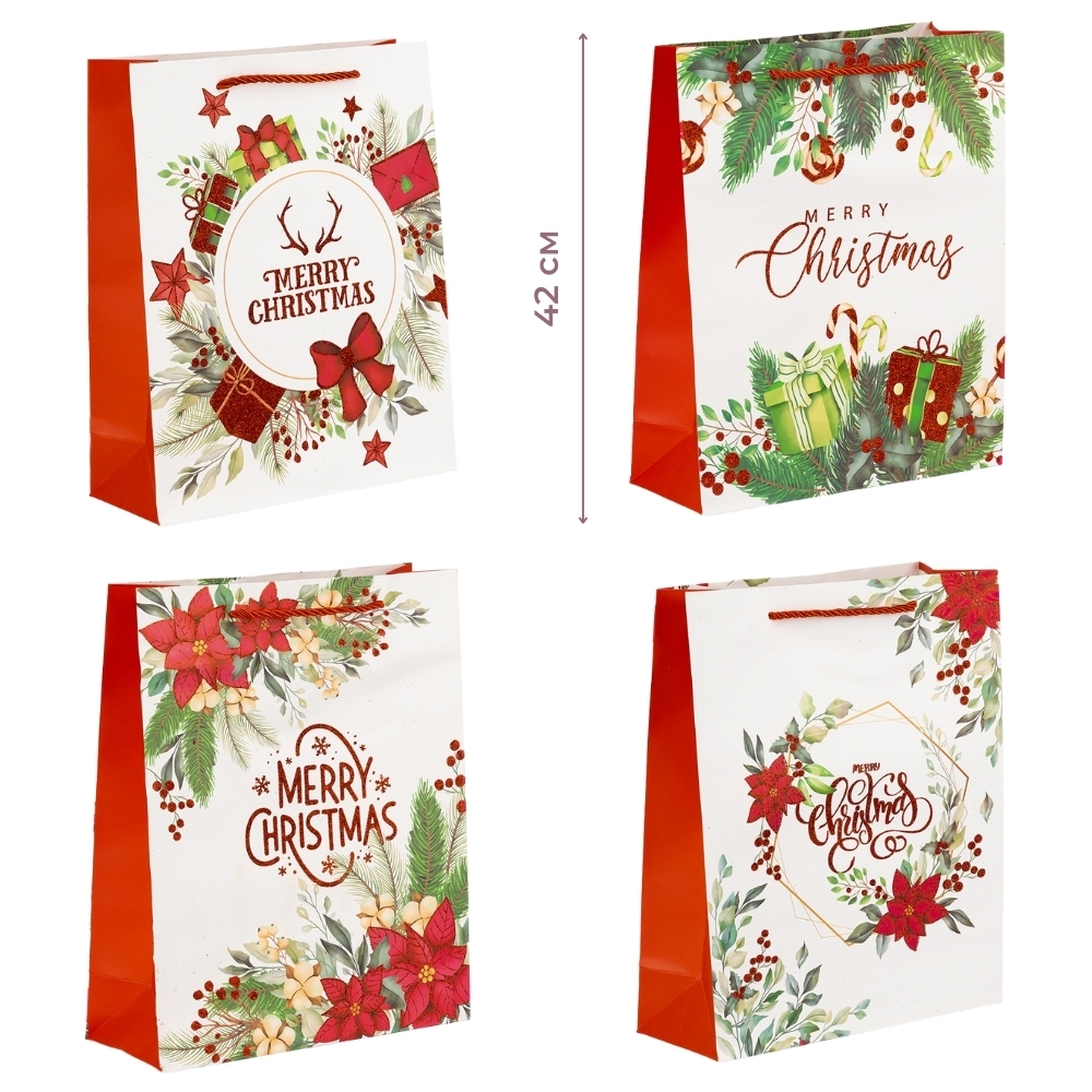 Висота - 42 см, довжина - 31 см, ширина - 12 см. В пакуванні 12 пакетів різного дизайну. Подарунковий пакет створює особливу атмосферу очікування і радості, підкреслюючи значення подарунка і роблячи його прийняття ще більш особливим і запам'ятовуваним. Паперовий матеріал додає легкості, але водночас забезпечує достатню міцність для перенесення подарунків. Цей пакет ідеально підходить для упаковки подарунків для близьких та друзів, даруючи їм теплі почуття святкової атмосфери. Красива новорічна тематика пакета не лише зробить його привабливим зовнішньо, але й створить настрій очікування та радості, відображаючи дух цього чарівного свята.