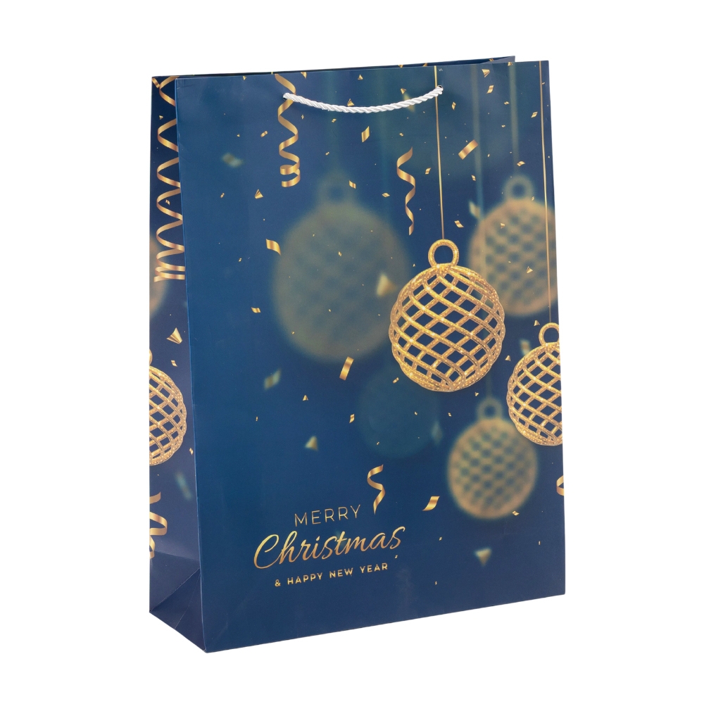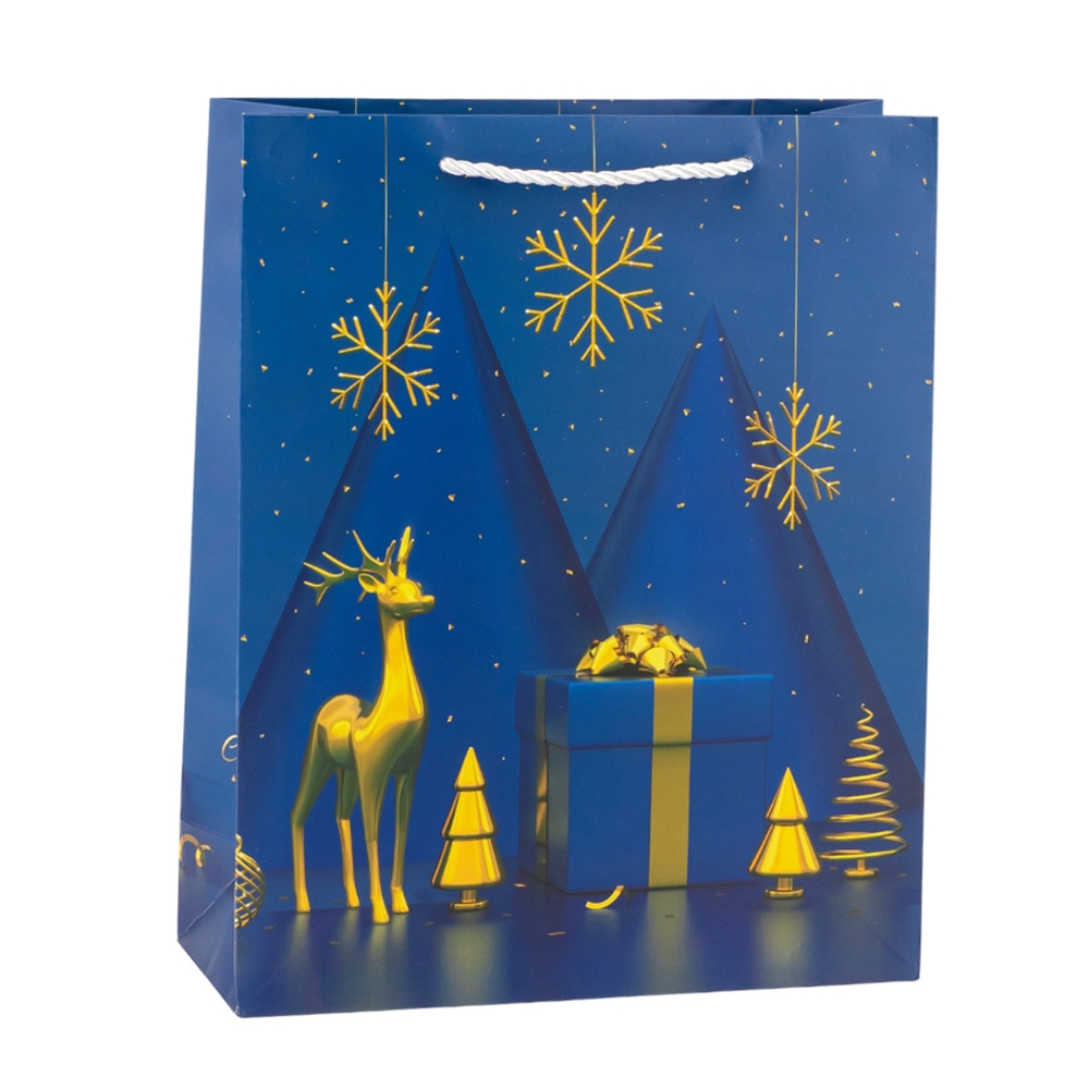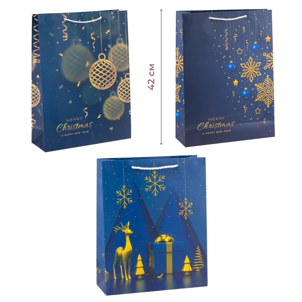 Висота - 42 см, довжина - 31 см, ширина - 11 см. В пакуванні 12 пакетів. Подарунковий пакет створює особливу атмосферу очікування і радості, підкреслюючи значення подарунка і роблячи його прийняття ще більш особливим і запам'ятовуваним. Паперовий матеріал додає легкості, але водночас забезпечує достатню міцність для перенесення подарунків. Цей пакет ідеально підходить для упаковки подарунків для близьких та друзів, даруючи їм теплі почуття святкової атмосфери. Красива новорічна тематика пакета не лише зробить його привабливим зовнішньо, але й створить настрій очікування та радості, відображаючи дух цього чарівного свята.