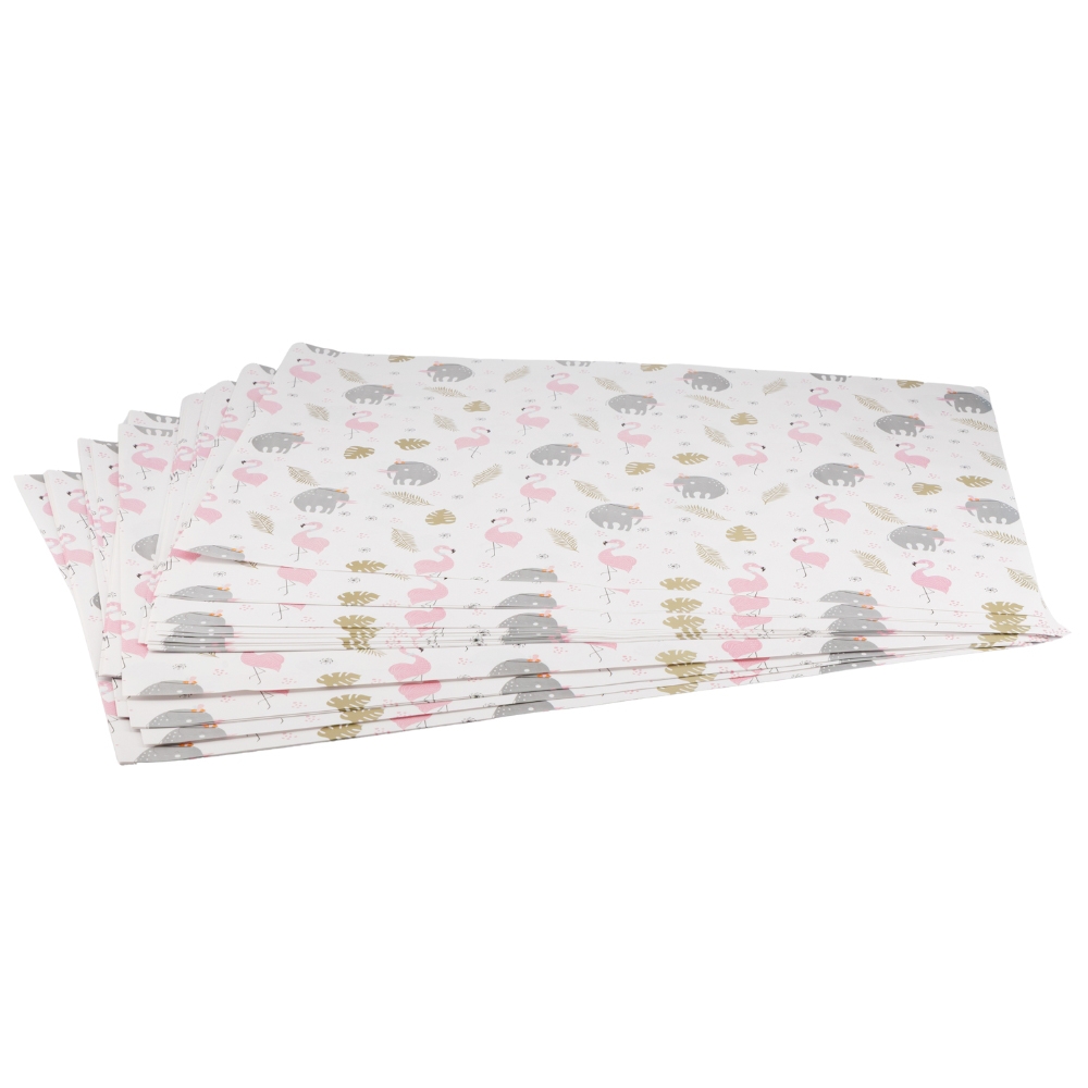 Довжина - 70 см, ширина - 50 см. В пакуванні 100 шт. Стильний пакувальний папір із яскравим тропічним принтом — рожеві фламінго та милі сірі слоники створюють грайливий настрій. Такий дизайн чудово підійде для дитячих свят, подарунків на день народження чи просто для тих, хто любить оригінальність та яскраві акценти. Папір щільний, легко складається та зберігає форму, тому ваш подарунок виглядатиме акуратно та святково. Ідеальний вибір для декораторів, магазинів подарунків та тих, хто хоче здивувати оригінальною упаковкою!