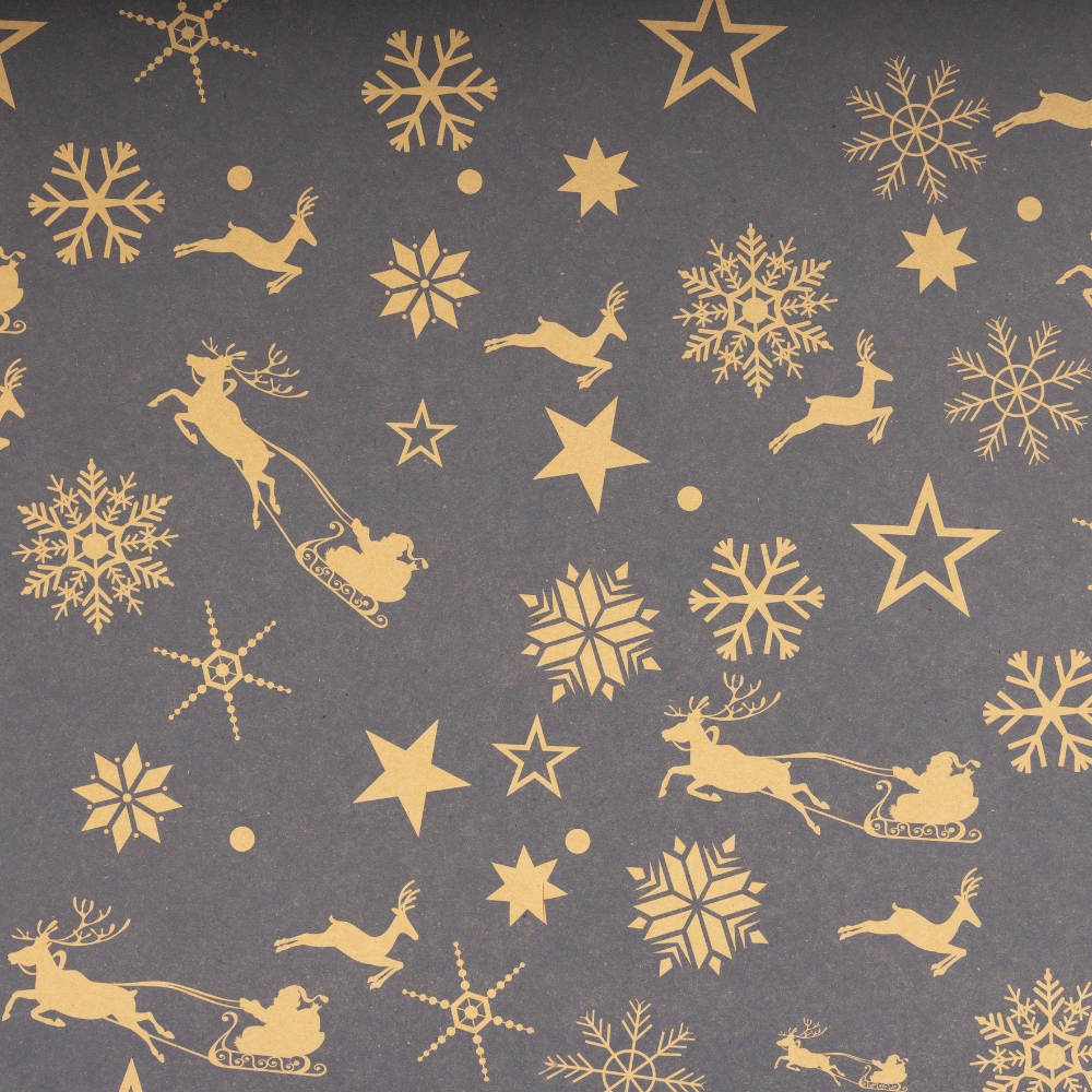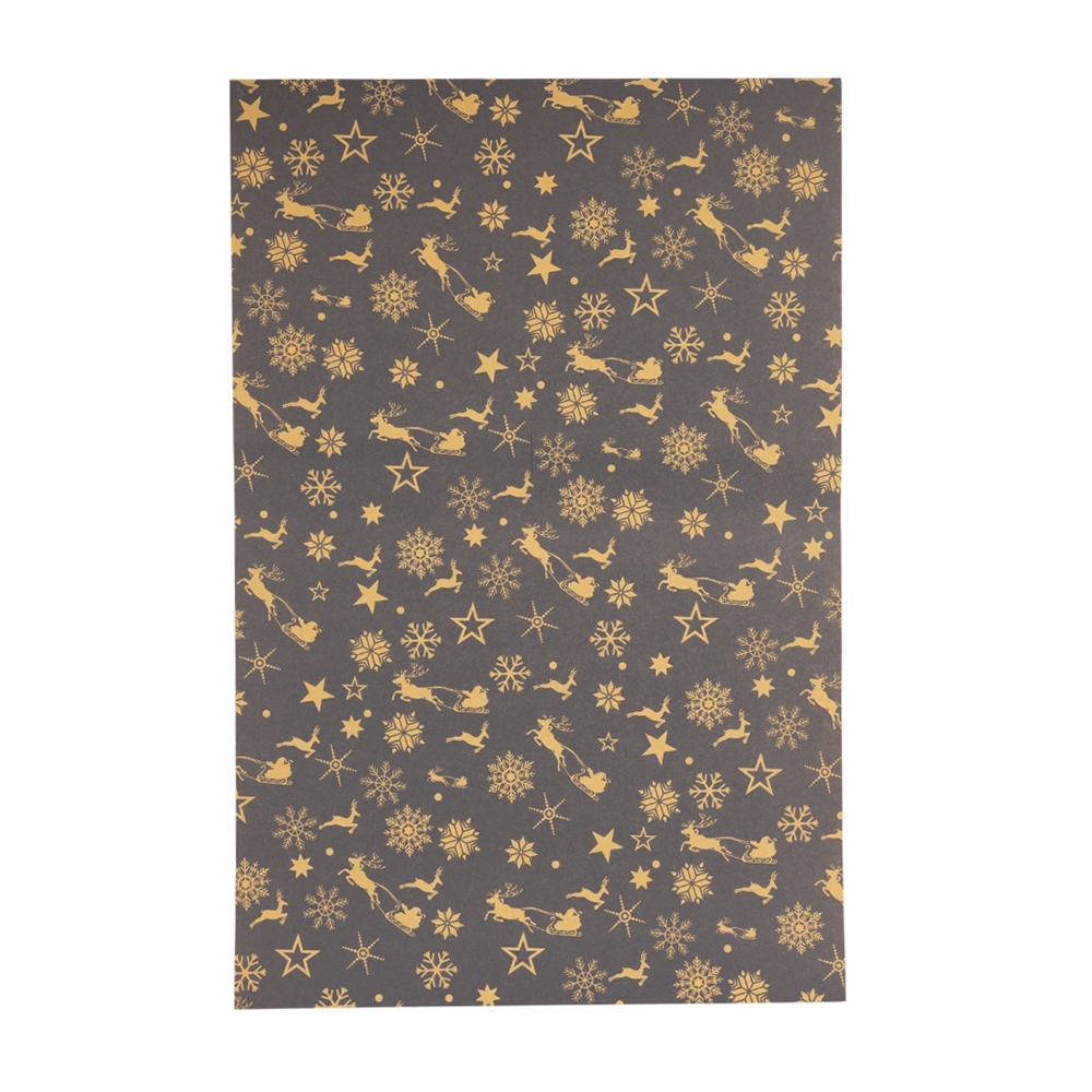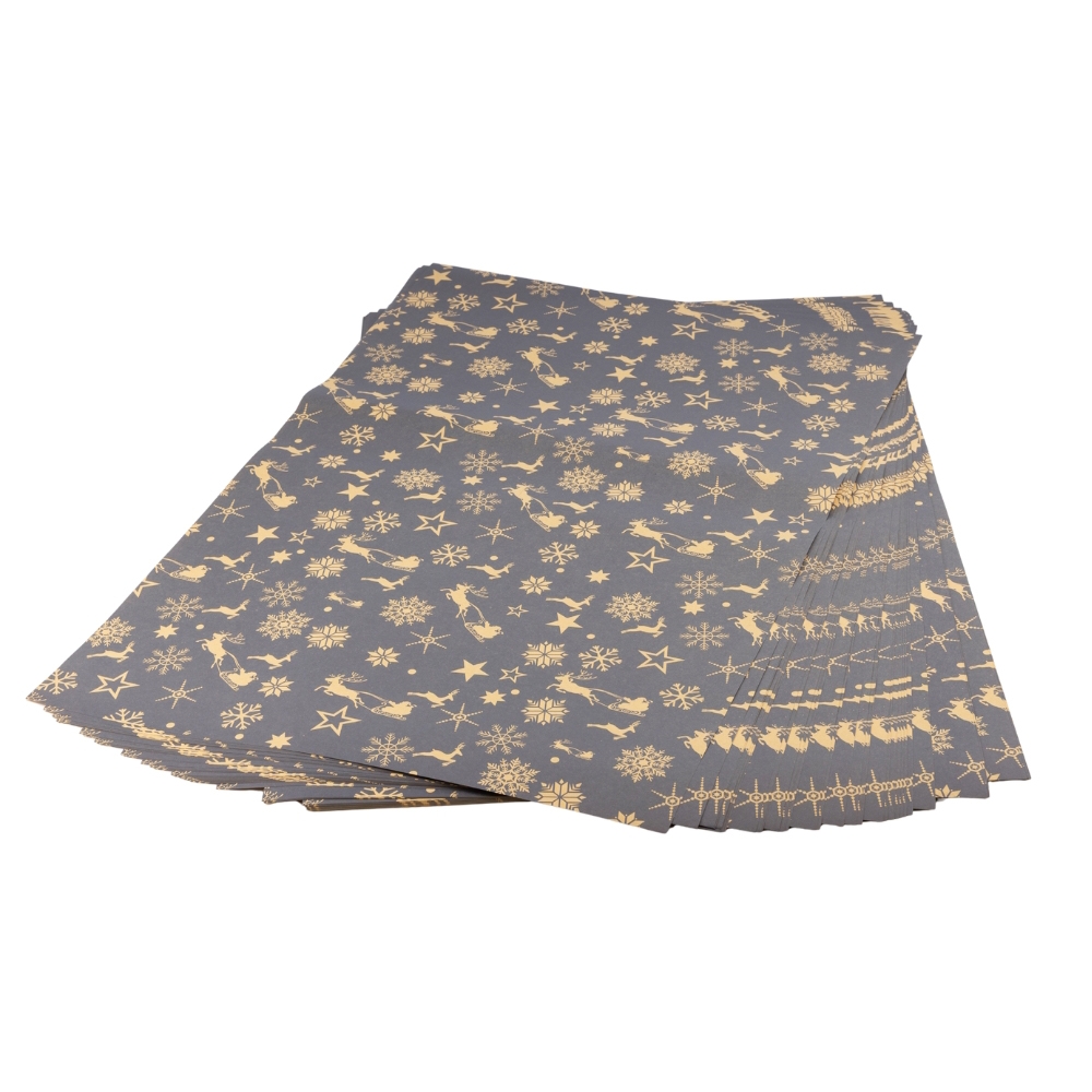 Довжина - 70 см, ширина - 50 см. В пакуванні 100 шт. Елегантний пакувальний папір із золотими сніжинками, зірками та санями Санти на темно-синьому тлі створює відчуття справжнього зимового дива. Щільний і якісний матеріал легко складається та тримає форму. Ідеально підходить для святкових подарунків, оформлення вітрин і декору у стилі HoReCa.